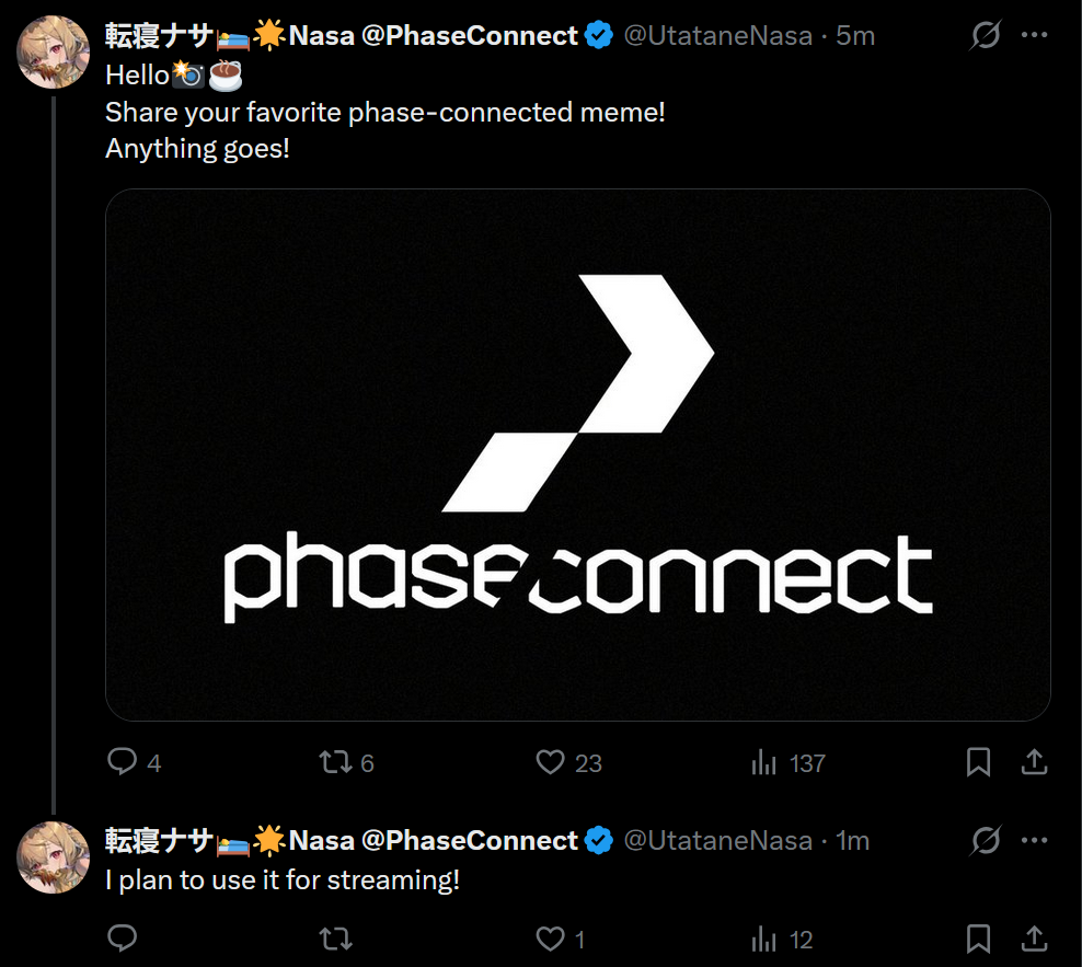 ▼ Phase Connect LinksOfficial Website: https://phase-connect.comOfficial Schedule: https://schedule.phase-connect.comOfficial Twitter: https://x.com/PhaseConnect | https://x.com/PhaseConnectJPOfficial Character References: https://rentry.org/pcgreferencesOfficial Twitch Archive Channels: https://rentry.org/pcgtwitcharchiveUnofficial Phase Connect Archives: https://rentry.org/pcgunofficialarchive––––––––––––––––––––––––––––––––––◆【Lia】https://x.com/rinkouashelia | https://youtube.com/RinkouAshelia | https://twitch.tv/asheliarinkou◆【Utatane Nasa】転寝ナサ (JP) https://x.com/UtataneNasa | https://youtube.com/UtataneNasa | https://twitch.tv/utatanenasa◆【Hakushika Iori】白鹿いおり (JP + EN) https://x.com/hakushikaiori | https://youtube.com/HakushikaIori | https://twitch.tv/iorihakushika◆【Fujikura Uruka】https://x.com/fujikurauruka | https://youtube.com/FujikuraUruka | https://twitch.tv/fujikurauruka◆【Shisui Michiru】紫翠みちる (JP) https://x.com/shisuimichiru | https://youtube.com/ShisuiMichiru | https://twitch.tv/michiru_shisui◆【Tenma Maemi】https://x.com/tenmamaemi | https://youtube.com/TenmaMaemi | https://twitch.tv/tenma◆【Pipkin Pippa】https://x.com/pipkinpippa | https://youtube.com/PipkinPippa | https://twitch.tv/pippa––––––––––––––––––––––––––––––––––◆【Kaneko Lumi】https://x.com/kaneko_lumi | https://youtube.com/KanekoLumi | https://twitch.tv/kanekolumi◆【Fuura Yuri】[Terminated] https://x.com/AmarisYuri | Archive: https://youtube.com/@TheNationalFuuraYuriArchive◆【Dizzy Dokuro】https://x.com/dizzydokuro | https://youtube.com/@dizzydokuro | https://twitch.tv/dizzydokuro◆【Jelly Hoshiumi】https://x.com/jellyhoshiumi | https://youtube.com/@jellyhoshiumi | https://twitch.tv/jellyhoshiumi◆【Ember Amane】https://x.com/emberamane | https://youtube.com/@EmberAmane | https://twitch.tv/emberamane◆【Clio Aite】https://x.com/ClioAite | https://youtube.com/@ClioAite | https://twitch.tv/clioaite◆【MariMari_en】https://x.com/MARIMARI_EN | https://youtube.com/@MARIMARI_EN | https://twitch.tv/marimari_en◆【Eepy Sleepy】https://x.com/EepySleepyCh | https://youtube.com/@EepySleepyCh | https://twitch.tv/EepySleepy––––––––––––––––––––––––––––––––––◆【Remilia Nephys】https://x.com/Remilia_Nephys | https://youtube.com/RemiliaNephys | https://twitch.tv/remilianephys◆【Chisaka Airi】https://x.com/ChisakaAiri | https://youtube.com/ChisakaAiri | https://twitch.tv/chisakaairi◆【Amanogawa Shiina】https://x.com/AmanogawaShiina | https://youtube.com/AmanogawaShiina | https://twitch.tv/amanogawashiina◆【Himemiya Rie】https://x.com/HimemiyaRie | https://youtube.com/HimemiyaRie | https://twitch.tv/himemiyarie◆【Erina Makina】https://x.com/ErinaMakina | https://youtube.com/ErinaMakina | https://twitch.tv/erinamakina◆【Komachi Panko】https://x.com/komachipanko | https://youtube.com/KomachiPanko | https://twitch.tv/komachipanko––––––––––––––––––––––––––––––––––◆【Runie Ruse】https://x.com/RunieRuse | https://youtube.com/@RunieRuse | https://twitch.tv/RunieRuse◆【Eimi Isami】https://x.com/eimiisami | https://youtube.com/@eimiisami | https://twitch.tv/eimiisami◆【Muu Muyu】https://x.com/Muu_Muyu | https://youtube.com/@MuuMuyu | https://twitch.tv/MuuMuyu◆【Hikanari Hina】https://x.com/HikanariHina | https://youtube.com/@HikanariHina | https://twitch.tv/HikanariHina◆【Saya Sairroxs】[Hort] https://x.com/sayasairroxs | https://youtube.com/@sayasairroxs | https://twitch.tv/sayasairroxs––––––––––––––––––––––––––––––––––◆【Kannagi Loki】巫ロキ (JP) https://x.com/kannagiloki | https://youtube.com/@kannagiloki ◆【Kokoromo Memory】恋衣めもり (JP) https://x.com/kokoromomemory | https://youtube.com/@kokoromomemory_ | https://twitch.tv/kokoromomemory◆【Gram Pico】倉夢ぴこ (JP) https://x.com/grampico_ | https://youtube.com/@grampico | https://twitch.tv/grampico◆【Ayase Yuu】絢世ユウ (JP) https://x.com/ayaseyuuu | https://youtube.com/@ayaseyuu | https://twitch.tv/ayaseyuu_◆【Kaminari Clara】歌美鳴クララ (EN + JP) https://x.com/kaminariclara_ | https://youtube.com/@kaminariclara | https://twitch.tv/kaminariclara––––––––––––––––––––––––––––––––––◆【Malice Evermore】https://x.com/MaliceEvermore | https://youtube.com/@maliceevermore | https://twitch.tv/maliceevermore◆【Nitya Nil】https://x.com/Nitya_Nil | https://youtube.com/@Nitya_Nil | https://twitch.tv/nitya_nil◆【Wilhelmina Frost】https://x.com/wilhelminafr0st | https://youtube.com/@wilhelminafrost | https://twitch.tv/wilhelminafrost◆【Bibi Biscuit】https://x.com/BibiBiscuitCh | https://youtube.com/@bibibiscuitch | https://twitch.tv/bibibiscuitch◆【Anya Nyabyss】https://x.com/AnyaNyabyss | https://youtube.com/@AnyaNyabyss | https://twitch.tv/anyanyabyss◆【Sinon Sinfonia】https://x.com/SinonSinfonia | https://youtube.com/@SinonSinfonia | https://twitch.tv/sinonsinfoniaPrevious Thread: >>108751439