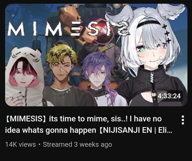 Nijisanji EN YouTube channels:https://www.youtube.com/@nijisanji_en/channelsX:https://x.com/NIJISANJI_Worldhttps://x.com/i/lists/1415262975435231235LazuLight:https://x.com/EliraPendorahttps://x.com/FinanaRyuguOBSYDIA:https://x.com/Petra_GurinEthyria:https://x.com/MillieParfaithttps://x.com/EnnaAlouetteLuxiem:https://x.com/Luca_Kaneshirohttps://x.com/Shu_Yaminohttps://x.com/Vox_AkumaNoctyx:https://x.com/Sonny_Briskohttps://x.com/Uki_Violetahttps://x.com/Alban_KnoxILUNA:https://x.com/MariaMari0nettehttps://x.com/AiaAmarehttps://x.com/ScarleYonagunihttps://x.com/RenZott0XSOLEIL:https://x.com/D_Dropscythehttps://x.com/MelocoKyoranhttps://x.com/Ver_VermillionKrisis:https://x.com/VezaliusBandagehttps://x.com/Tyrant_Vantahttps://x.com/YuQWilsonTTT:https://x.com/ClaudeClawmarkDenauth:https://x.com/RyomaBarrenworthttps://x.com/KlaraCharmwoodBY THE BEAT:https://x.com/Seible_2434https://x.com/KaelixDebonairhttps://x.com/Freo_2434https://x.com/ZealGinjokaTeamup schedule for Nijisanji EN:https://teamup.com/kstk7egnopr3xiqj4hTo watch streams at the same time:https://niji-mado.chats.ninja/homeGraduated Livers and Miscellaneous:https://rentry.org/7k4s6manReminder to ignore bait, shitposting, samefags, discordfags, numberfags, tribalfags, and falseflaggers.Previous thread: >>108756745