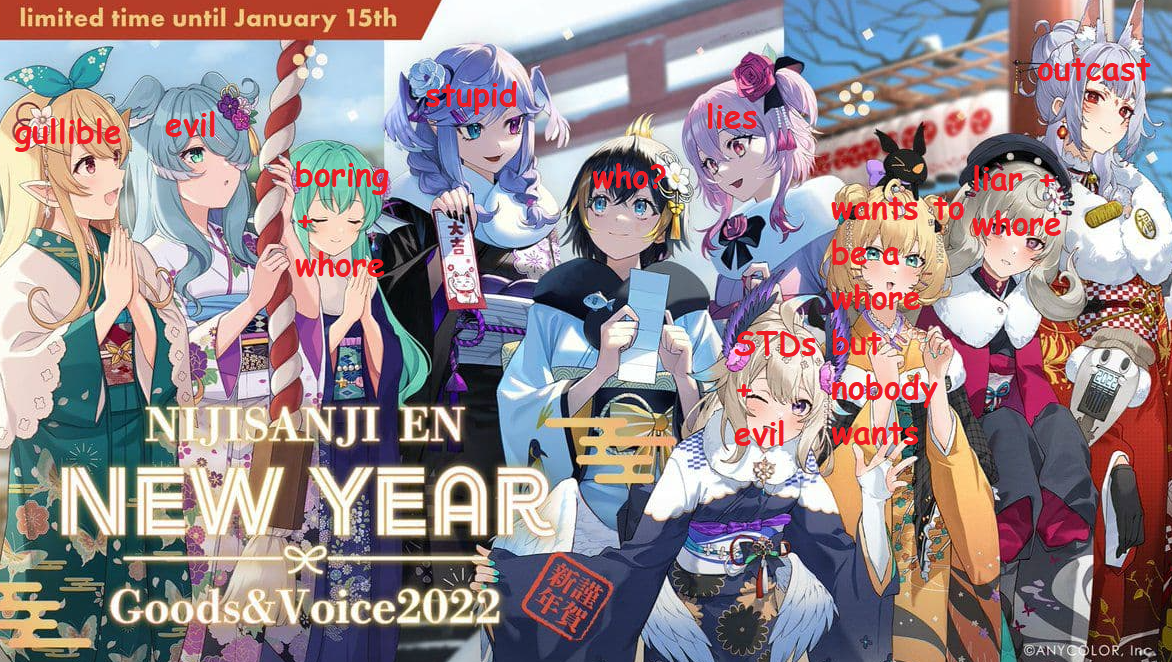 >>108765988Probably a mix of bunch of things, the miko stuff, the haachama stuff, the phase yabs, mint having another melty, and I saw people shitting on doki for who knows what. All of those fanbases use niji as their scapegoat so it's probably a mix of all of those.