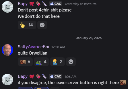 Remember to not post 4chin shit on her server and to leave immediately away if you do.Thank you Bapy.