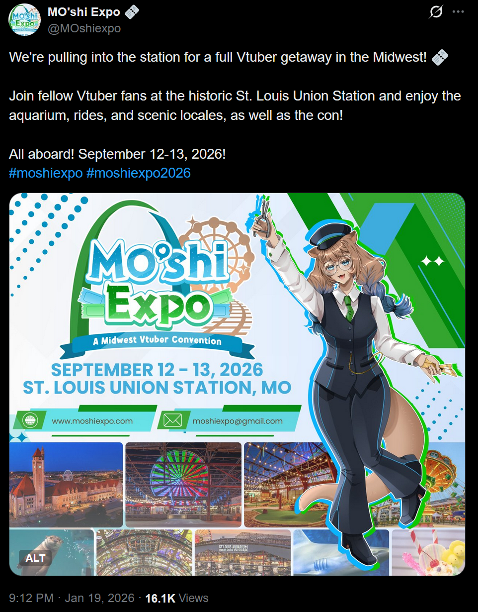 A VTuber convention is happening in Missouri in September.https://x.com/MOshiexpo/status/2013434463032668457https://moshiexpo.com/