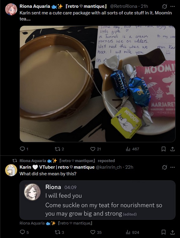 >>108800570Well during the kick off what made it official was Riona inviting the other 4 at the time into watching a movie and playing a game with her in a chat and then proposing they start a vtuber twitch group. They had some ideas for the name involving retro but Freya proposed Retromantique which they went with. Riona was the only one a twitch partner at the time so she was the one that formed it and invited the others in.But for the lead up to that, it was a few different things. I don't remember it 100% but it was something like: Freya and Riona knew each other already I believe. Karin and Hespera too, they go way back and collabed before too. Karin got recommended Yuno Nightingale as another cool retro ojousama vtuber and they became friends. The topic of Zelda came up in Yuno's chat and her viewers mentioned Riona as someone who played a lot of majora's mask rando at the time along with some other games and Yuno said she would check her out. The two ended up bonding over their pashion for Lolita fashion, video games and vtubing. Similarly Riona was mentioned in Karin's chat occassionally. Initially Karin said Riona seemed scary but the two ended up hitting it off and becoming close friends too for similar reasons and interests as Riona and Yuno.Yumanea_ joined later, during an anniversary event that Karin was holding where it was announced. Some people had been wondering about her in the lead up to that too since she was similarly friends with retromantique members. This was about 2-3 years ago now so my mind... it's slightly hazy unfortunately.