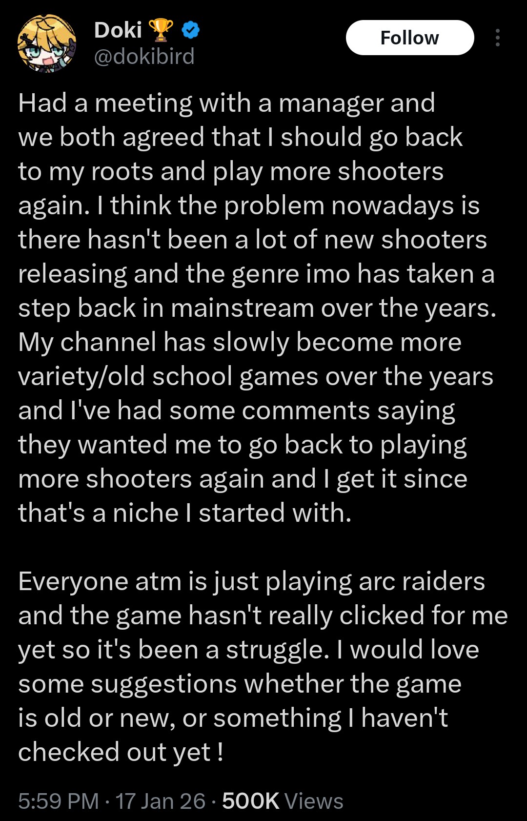 >Wanting her to play more shooters