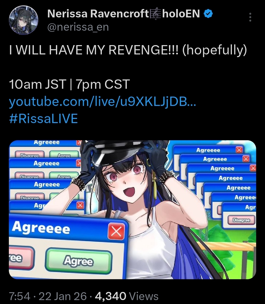 For the 851st time, what is Ope?!https://www.youtube.com/watch?v=qb_-taYLRfYAlso ENTER the Demon of Sound and Lover of Idols, Nerissa Ravencroft from Hololive EN Advent.>Streams▼ Upcoming streams1/22 1900 CST | TBD 1/23 1900 CST | Cookie Run Kingdom▼ Previous appearancesSOUNDHOUNDS JAPAN TRAVEL】snowy hinamizawa trip?! | https://www.youtube.com/watch?v=pGMDBGgHFHMRisu's Birthday Live | https://www.youtube.com/watch?v=VYSAfYJ6FhI&t=540【AmiAmi】AmiAmi hololive Figure Award 2025 | https://www.youtube.com/watch?v=Rn-t5NlNkN8Twitter space with Fuwamoco | https://x.com/i/spaces/1yoKMPAddznxQ | https://files.catbox.moe/sugqfz.m4a▼ Previous streamsIt's an Adventure in a New World! | Hytale | https://www.youtube.com/watch?v=QarAqDV_wjISo much happening! | Members-Only | https://www.youtube.com/watch?v=nnt_t4-T_YUWe Power, We Wash - We Announce... Something BIG! | PowerWash Simulator 2 | https://www.youtube.com/watch?v=uku2evQBo9oI got a job! | Animal Shelter 2 | https://www.youtube.com/watch?v=isUJOwfPeQU>MusicPlaylist | https://www.youtube.com/watch?v=YDyrIDHAdDY&list=PLSJG6WXf5JvFn2FWv_B5HP7DklUtdeZiMYour Idol (feat. Mori Calliope, Ouro Kronii & FUWAMOCO) | https://www.youtube.com/watch?v=vw9MkB-sNMAGnarly (feat. Shiori Novella, Koseki Bijou & FUWAMOCO) | https://www.youtube.com/watch?v=TxBIA_ePWT0Archive of the struck down Moka - Lilium coverhttps://archive.ragtag.moe/watch?v=-GUdYPelG8cNew Years Karaoke | https://gofile.io/d/sUZsw4Unarchived karaoke (Feb 2025)https://archives.alwayswait.ing/hololive/nerissaravencroft/2025-02-15T00%3A55Z/Songs & Karaokes rentryhttps://rentry.org/karaokes_songs_v01>Recent Voice Packs>hololive Hmph! Don't Make Me Jealous! Voice Packhttps://shop.hololivepro.com/en/products/hololive_hmphdontmakemejealous>hololive Christmas Voice Pack 2025 ~Miracle for YU~https://shop.hololivepro.com/en/products/hololive_christmasvoice2025>hololive English -Advent- Horror Voice Drama: When Snow Falls Silenthttps://shop.hololivepro.com/en/products/hololiveenadvent_horrorvoicedrama_whensnowfallssilenthttps://www.youtube.com/watch?v=kuk1KJkEtK4>Recent Merch:>OTAKU https://otaku.shop/collections/hololive>Useful LinksYouTube: https://www.youtube.com/@NerissaRavencroftTwitter: https://twitter.com/nerissa_enTikTok: https://www.tiktok.com/@nerissaravencroftArt tags: #RavenCrafts on Twitter (Lewds: #depravencrafts on Twitter); RavenCrafts, Nerissa Ravencroft or ネリッサ・レイヴンクロフト on pixivPrevious thread: >>108759276A word of advice: as per >>1 , be smart and don't reply or engage in off-topic or blatant bad faith arguments. To keep peace, hide and report.