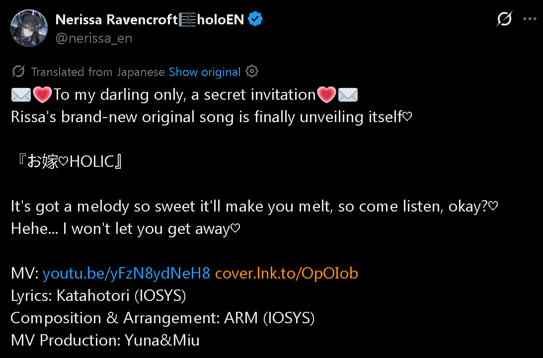 >>108829544>The original text is Japanese, not English.Grim, apparently she will actually make the main version in Japanese and for the English version we will have to manually change the audio track every time, well, if that’s the case, then I will not include it in my playlist, which plays her songs 24/7.