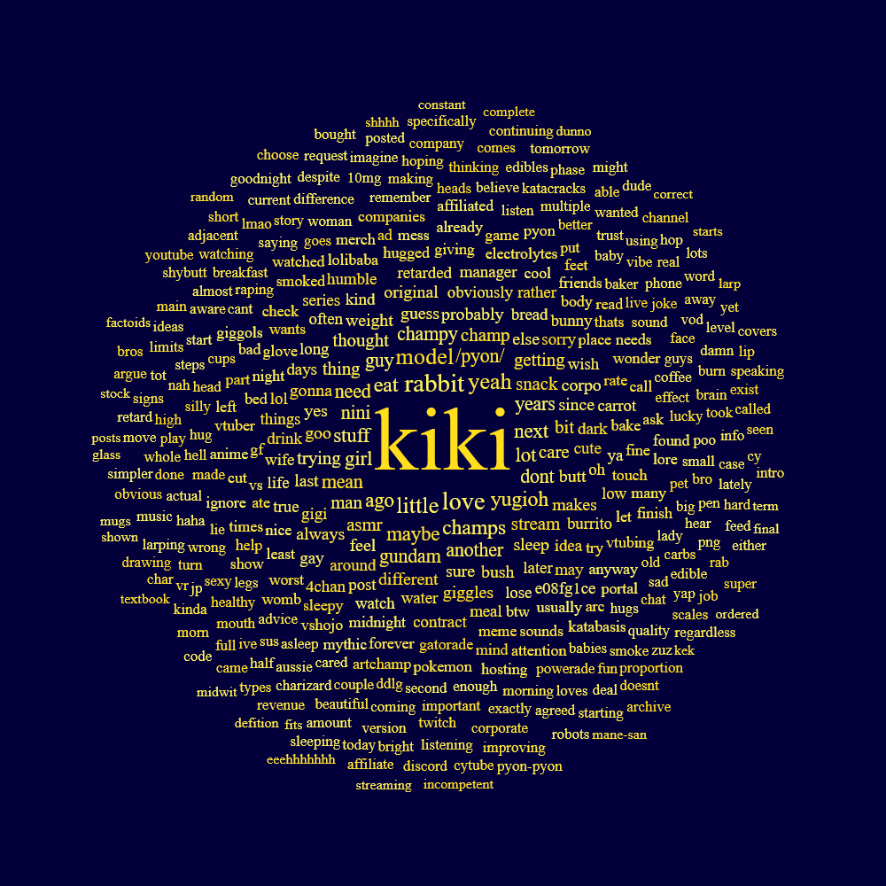 New model, who dis?This thread is to discuss /vt/‘s very own Kiki.>LATEST STREAMhttps://youtu.be/USe4_8aRCu0>Who is Kiki?Kiyomi Pyon-Pyon, or Kiki for short is an adorable autistic Aussie chuuba. She's a wicked bright, and super sweet girl with a passion for animals and her champyons!https://youtu.be/1vjStYtGkJshttps://youtu.be/PyeTpOgLWiY>Carrdhttps://kikipyonpyon.carrd.co/>Kiki Lore and Intro Videoshttps://youtu.be/W-bLrgrXdSghttps://youtu.be/eweZ2EDK7v4https://youtu.be/wxL2YkOhaMs>NEWEST KIKI CLIPShttps://youtu.be/di3tiC80MC8https://youtu.be/2sd-aYoaOtghttps://youtu.be/YN_1OOVO7oohttps://youtu.be/EOkMNgZTzbE>KATABASIS WEBSITEhttps://katabasis.moe/>Merch (*NEW: Katabasis Merch, Soap, Butt Mousepad, Keychains, Stickers,* Deskmat, Magnets, Coasters, JP Snack Pack, Tapestry, Standee, Daki)https://memebars.com/collections/the-katabasis-collectionhttps://shop.moso.moe/kiki-pyon-pyon/https://weebe.net/shop/character-goods/keychains/kiki-pyon-pyon-baking-time-acrylic-keychain/ code: KATABASIS5 (5% off)https://www.capippalisttradeguild.com/product/13x19-print-kiki-feet-rishartist-/264https://www.capippalisttradeguild.com/product/9in-dakimakura-keychain-kiki-pyonpyon/263https://diipoo.com/shop/kiki-daki/>Danboorus, Aggie, & /i/ thread (Art/Fan Content)https://pyon.websitehttps://booru.rabbalabs.com/Previous Aggies: https://pyon.website/pools/1>>>/i/723670>Katabasis Covers:https://youtu.be/JB6GhjWT4lshttps://www.youtube.com/watch?v=BgzyBpO8Oukhttps://www.youtube.com/watch?v=vu7a6PjiSpohttps://www.youtube.com/watch?v=62Z2a4f6k7k>Kiki's Covers and Songshttps://youtu.be/xwHH28JFrnUhttps://youtu.be/2tPTie7UmyUhttps://youtu.be/Zpdu7yFk1tAhttps://youtu.be/24K-LkEhLqkhttps://youtu.be/8v9OUHzxy_ohttps://youtu.be/7JSSOnss85Yhttps://youtu.be/FzMJ0LWTUYQhttps://youtu.be/TXi-SDZJEwEhttps://youtu.be/XLKYnOALHac>ASMR Collection, Voicepacks & AI LoRAshttps://rentry.org/7uqu8mvq>/pyon/ Cytube (Community Watchalongs):https://stream.rabbalabs.com/r/pyon>Kiki Notifications RSS feed w/ instructionshttps://rabbalabs.com/rss/feed.xmlhttps://pastebin.com/nGsaGEZh>Misc. Rabbalabs links (timestamp tagger, VOD search, /pyon/ archive)https://rabbalabs.com/tagger/https://rabbalabs.com/vods/https://rabbalabs.com/pyondex/>/pyon/craft serverhttps://rentry.org/pyoncraftguide>Champy Creative CornerChampy Creations playlist: https://www.youtube.com/playlist?list=PLuUil1VBO4o7PpCUPwTKvj_4l7UBE8toPMusic (Kikikore): https://www.youtube.com/playlist?list=PLuUil1VBO4o5iNrFvZm8eMQGtj9xnacjMKiki Ambient Album: https://drive.google.com/file/d/18C-GvhOs5uG90xx4Et-yIF2QJHSUV0Eg/viewAnimations: https://www.youtube.com/playlist?list=PLuUil1VBO4o4TyrbqW87D2aygzbUMLMVsKiki Koikatsu Archive: https://mega.nz/folder/Bx4XXYTb#o7L7D5bg4XverGHQ03upkQKiki Noises Sound Effects Library: https://mega.nz/folder/LnRjWaoL#UL6z0KJcBwRPBapmRdAg2QKikinese: https://files.catbox.moe/yv1xre.pdfKiki Doom 2 WAD: https://files.catbox.moe/pd9lr9.zip/pyon/ Worms game: https://mega.nz/folder/46VjwSRS#DihAVX2GfbOvMiY0X_1nEASuper Champ Bros (SMB rom hack): https://files.catbox.moe/0tbbps.zipAoE2 Kiki civ mod: https://www.ageofempires.com/mods/details/316335/https://www.ageofempires.com/mods/details/316395/Kiki DoW Banners/Badges: https://files.catbox.moe/n6qe1d.zip/pyon/ Tetris: https://seburd.itch.io/tetrispyon>Related places>>>/vt//freak/ >>>/vt//vrt/>Last thread>>108753717