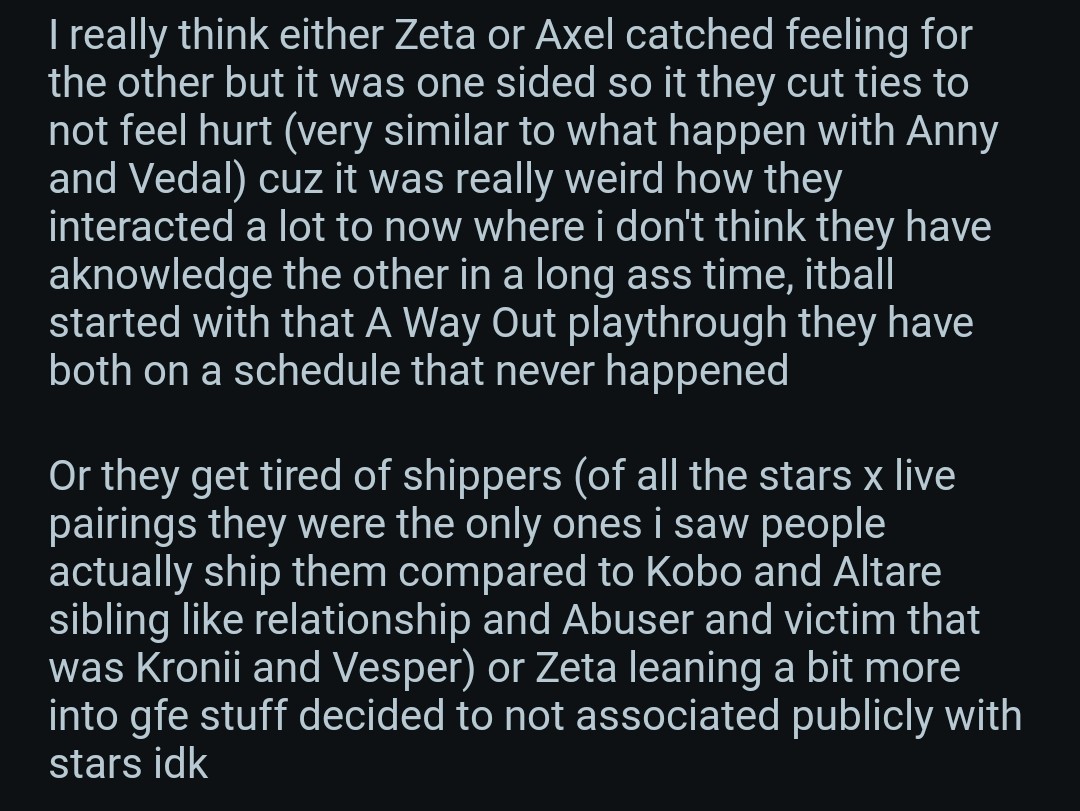 >>108813854I'm gonna entertain this nigga and say that..... there's is a high chance one of them caught feelings, with Zeta openly thirsting for Axel it actually makes me believe it was him that caught feelings for her thanks to the shippers, now you might ask why not the other way around if she was orbitting to Axel's cock? simply because Zeta is more of a hoe than we can imagine, so when shippers got into axel's head (which happened with many male vtubers who thought their female collaborators wanted to fuck becaus eof shippers) she most likely went ''Bro it was just some RP, calm down''