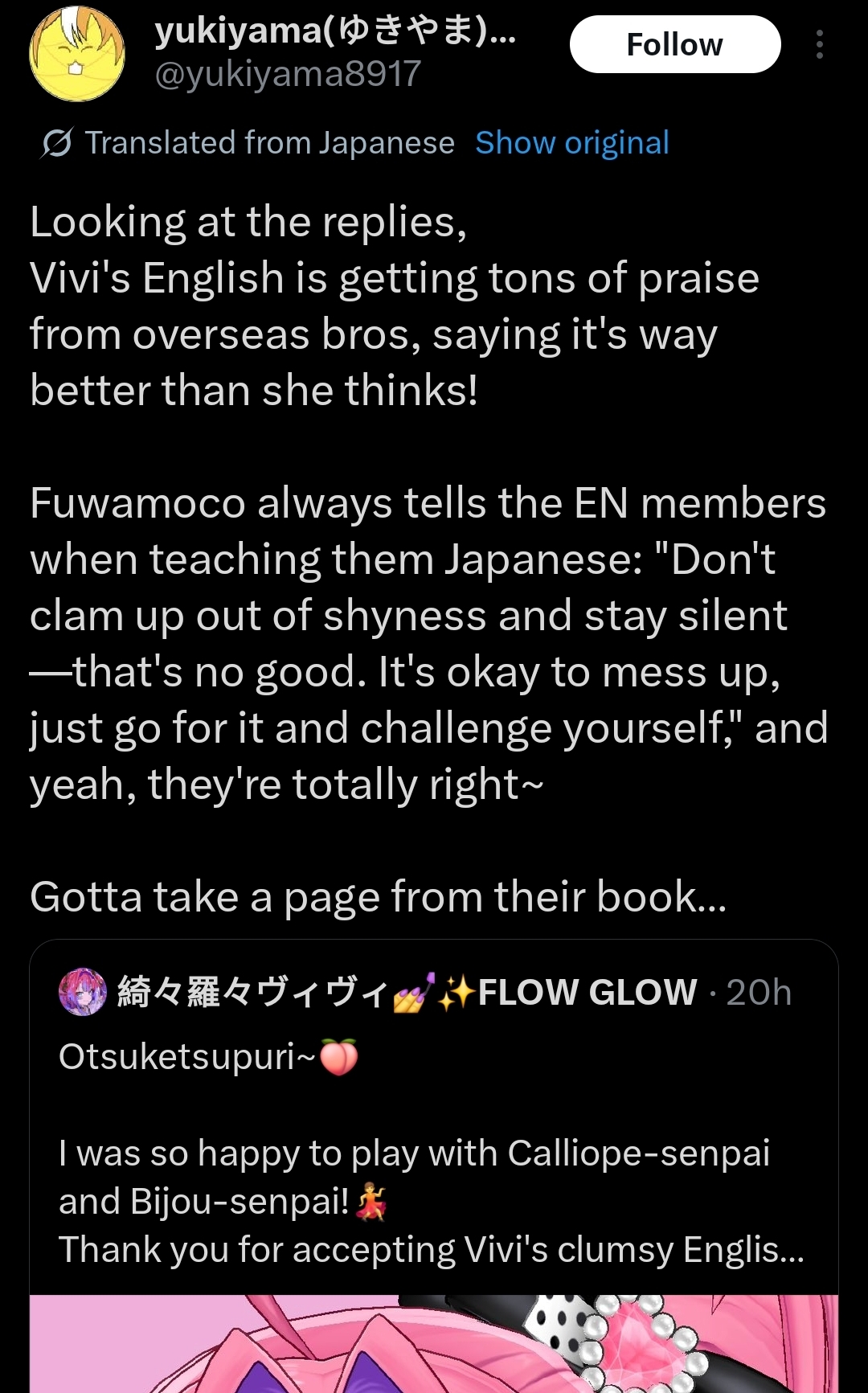>>108814073Cute. FuwaMoco have indeed been pushing other ENmem, especially Nerissa, to properly learn Japanese