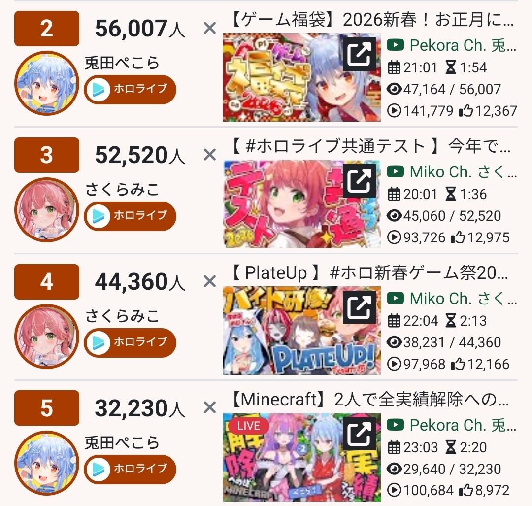 * FINAL TALLY OF THE DAY IS IN *Here it goes>56,007: Pekora (Hololive)>52,588: Miko (Hololive)>44,360: Miko (Hololive)>32,233: Pekora (Hololive)>30,362: AZKi (Hololive)>27,534: Nijisanji (Nijisanji)>23,695: Subaru (Hololive)>20,828: Miku (Nijisanji)>19,915: VSPO (VSPO)>15,793: Okayu (Hololive)>15,209: Saba (Indie)>14,123: IRyS (Hololive)>14,018: Kanae (Nijisanji)>13,880: Toya (Nijisanji)>12,396: Furen (Nijisanji)>11,990: Kanae (Nijisanji)>11,935: Kagami (Nijisanji)>11,611: Fubuki (Hololive)>11,607: Vivi (Hololive)>10,624: Bijou (Hololive)Peko-Miko-Miko podium with Steam purchases, HoloTest and PlateUP