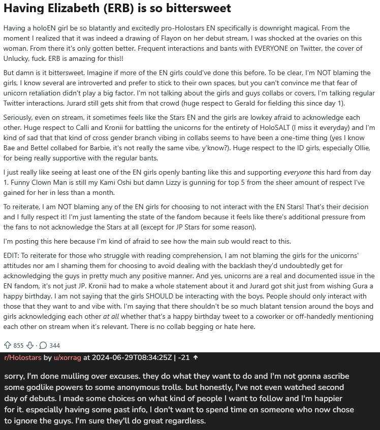 >>108817696>>108817762Both of these frankly reads as cope, and not actual solid reasons.Though granted, if Mori stealing the spotlight is a reason for her to stop, that just sounds like she no longer has to pretend to give a fuck about them.I already forgot which post I replied to, but it was the idea that two of the collabs were entirely spite driven, bur the homo push entirely driven by management that came off as completely unnatural, which led to the branch imploding by December