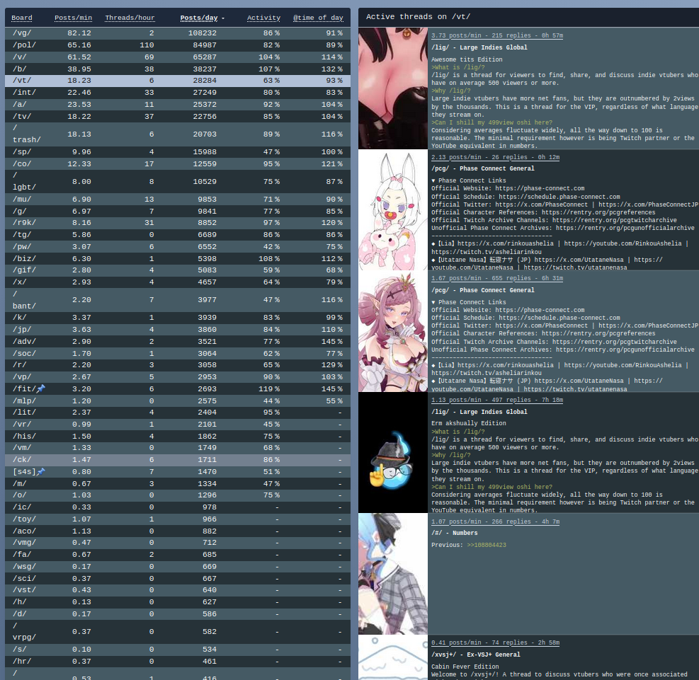 >>108812601*GENERAL NUMBERFAG SITES*>https://playboard.co/en/>http://ikioi-ranking.com/>https://vrabi.net/>https://live-ranking.userlocal.jp/vtuber-rankingHololive sites>https://www.hololyzer.net/youtube/index.html>https://trackholo.live/en/>https://holo-spotify-stats.jirikunes.eu/Twitch>https://sullygnome.com/>https://twitchtracker.com/>https://stats.roki.sh/>https://streamscharts.com/