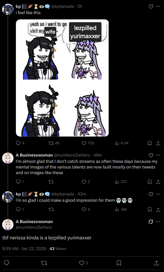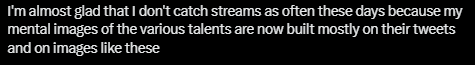 >>108813723enjoying the ship when it happens = goodreducing girls to only being components of a single ship = badthis dichotomy offends the average clipwatching Twitter denizen who spend all day thinking about ships unfortunately