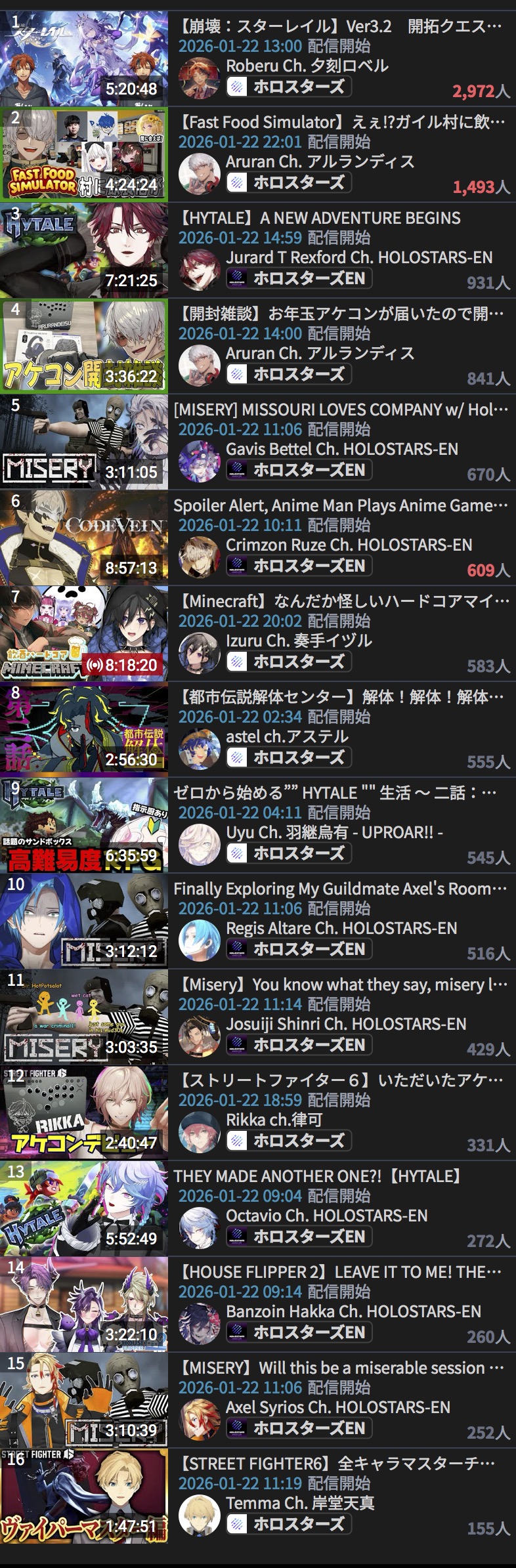 *JANUARY 22ND 2026 FINAL EN TALLY*>15,209: Saba (Indie)>14,123: IRyS (Hololive English)>10,624: Bijou (Hololive English)>7,651: Cecilia (Hololive English)>6,829: Bijou (Hololive English)>6,346: Nerissa (Hololive English)>6,012: Gigi (Hololive English)Close, really close. Gold for Sameko Saba's third playthrough of Hytale, Silver for Hoozuki IRyS' second playthough of Agree, Bronze for Koseki Bijou's playthrough of Warframe>RANKING PER POINTS (Gold = 3, Silver = 2, Bronze = 1)Bijou = 24pIRyS = 18pKronii = 13pGigi, Calliope = 12pMeloco, Saba = 11pRaora = 8pCecilia, FUWAMOCO = 4pIna'nis, Zotto = 3pNerissa = 2pBaelz, Nimi = 1p