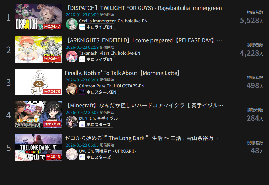 *JANUARY 22ND 2026 FINAL EN TALLY*>15,209: Saba (Indie)>14,123: IRyS (Hololive English)>10,624: Bijou (Hololive English)>7,651: Cecilia (Hololive English)>6,829: Bijou (Hololive English)>6,346: Nerissa (Hololive English)>6,012: Gigi (Hololive English)Close, really close. Gold for Sameko Saba's third playthrough of Hytale, Silver for Hoozuki IRyS' second playthough of Agree, Bronze for Koseki Bijou's playthrough of Warframe>RANKING PER POINTS (Gold = 3, Silver = 2, Bronze = 1)Bijou = 24pIRyS = 18pKronii = 13pGigi, Calliope = 12pMeloco, Saba = 11pRaora = 8pCecilia, FUWAMOCO = 4pIna'nis, Zotto = 3pNerissa = 2pBaelz, Nimi = 1p