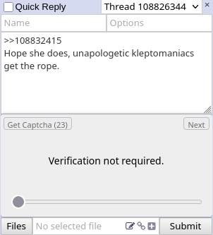 >>108832415Hope she does, unapologetic kleptomaniacs get the rope.
