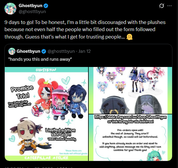 >>108832664This is why merch runs like this you should always either commit to having a set amount of stock, or do a group buy type of format (that is, set a minimum order quantity, and if it isn't reached, you cancel the entire thing)