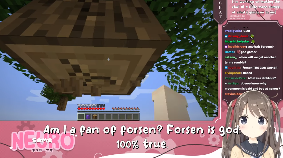 >Who is Neuro-sama?Neuro-sama is a neural network created by Vedal in 2018 for the purpose of learning to play osu! In December 2022 Vedal revived the project with the addition of a large language model, a TTS software and a Live2D model, which allow Neuro-sama to interact with her chat as a VTuber. Since then, she has been entertaining the chat with responses and unhinged rants nearly daily, as well as learning new skills such as singing, playing other games, and collaborating with other VTubers. Join /swarm/ today and welcome our new AI overlord!>Schedulehttps://post.nuro.lol/Neuro-Schedule-Bot>LinksTwitch: https://www.twitch.tv/vedal987YouTube:https://www.youtube.com/@Neurosamahttps://www.youtube.com/@OfficialNeurosamaClipsTikTok: https://www.tiktok.com/@neurosamaaiX:https://x.com/NeurosamaAIhttps://x.com/EvilNeuroAIThese and other official links: https://vedal.ai>Music & ClipsColorful Array - Neuro-sama (Official Video) - https://www.youtube.com/watch?v=FNfGw1wrKtUNEVER - Neuro x Evil (Official Video) - https://www.youtube.com/watch?v=CKCgoEGiUEgBOOM - Evil (Official Video) - https://www.youtube.com/watch?v=8Nt9YPnYyjs LIFE - Neuro-sama (Official Video) - https://www.youtube.com/watch?v=MDc1mjrIsPMhttps://neurokaraoke.comhttps://rentry.org/neuro-musichttps://rentry.org/neuro-videos>EducationalInterested in AI but don't understand it? Watch these:https://www.youtube.com/watch?v=WXuK6gekU1Yhttps://www.youtube.com/watch?v=d95J8yzvjbQ How does she know what to say? Watch this: https://www.youtube.com/watch?v=wjZofJX0v4MWant to learn more about AI? Read these: https://files.catbox.moe/kximv6.pngWant to (seriously) learn AI? Read these: https://files.catbox.moe/ajl3nx.png>MiscCatbox archives:https://rentry.org/swarm-archivehttps://rentry.org/swarm-archive-2Game Integration: https://github.com/VedalAI/neuro-game-sdk/LoRA: https://rentry.org/neuro-lora-v2Searchable VOD Transcripts: https://libraryofladev.com/VODs: https://www.youtube.com/@Neuro-samaUnofficialVODs>Merchhttps://neurosama.shop/>Previous thread>>108823784
