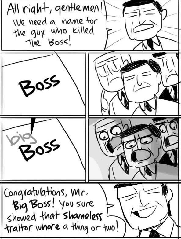 >snake eater playing while the boss just runs around>immediate t-bag on killing her>crocodile helmet in ending cutscene