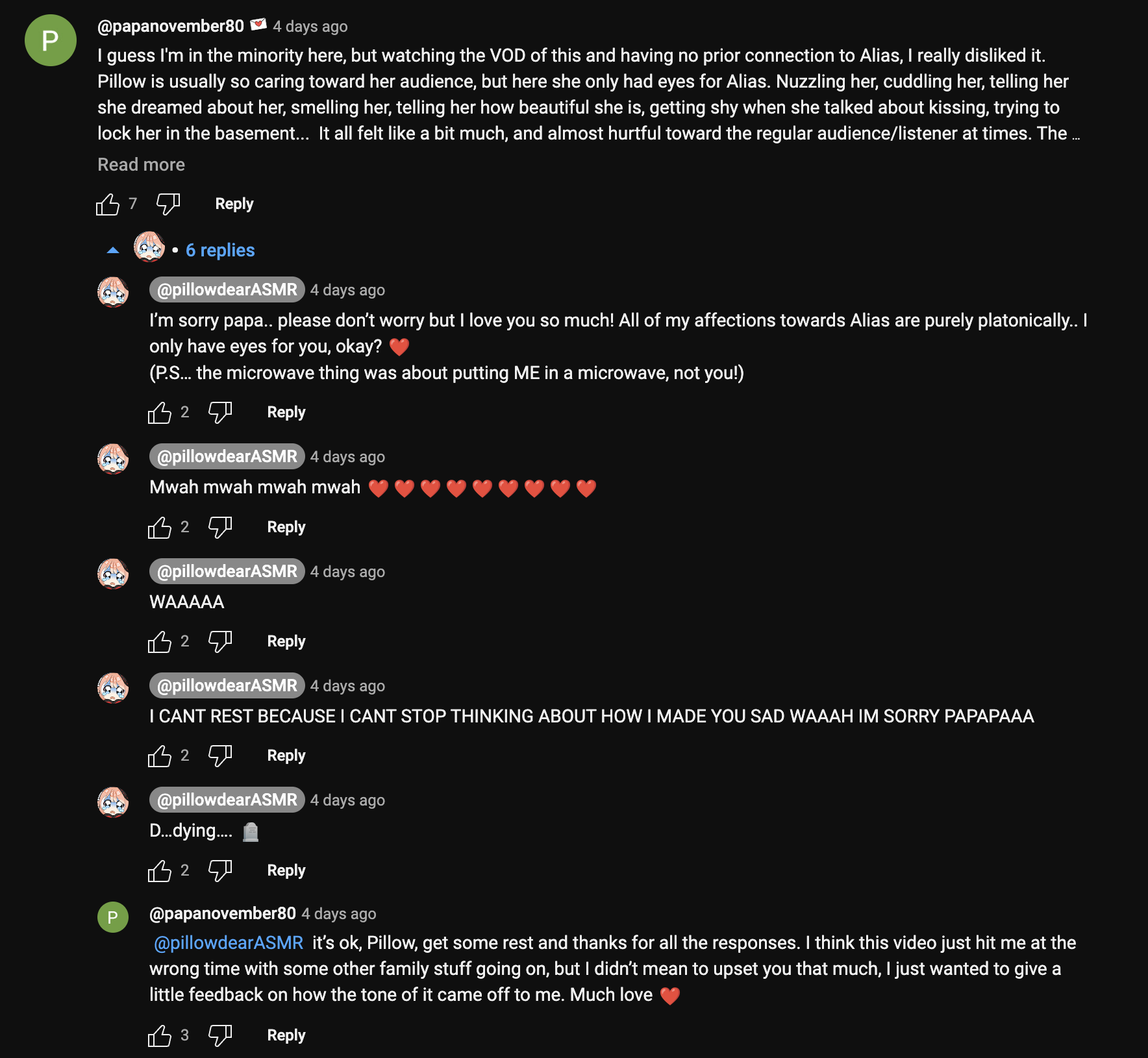 QRD since anon loves posting this this image is about two years old and pillow doesn’t do this stuff. It was her first collab with a vtuber, and she wasn’t used to fans being upset with her (she was also like 20 at the time). Pillow was more mentally ill back then.Shortly after this she actually banned the guy from the community and never left comments like this again. This is usually shared to try and make pillow look bad but she was just scared of making her fans upset.This was the stream: https://www.youtube.com/live/9UAspuPGqO0