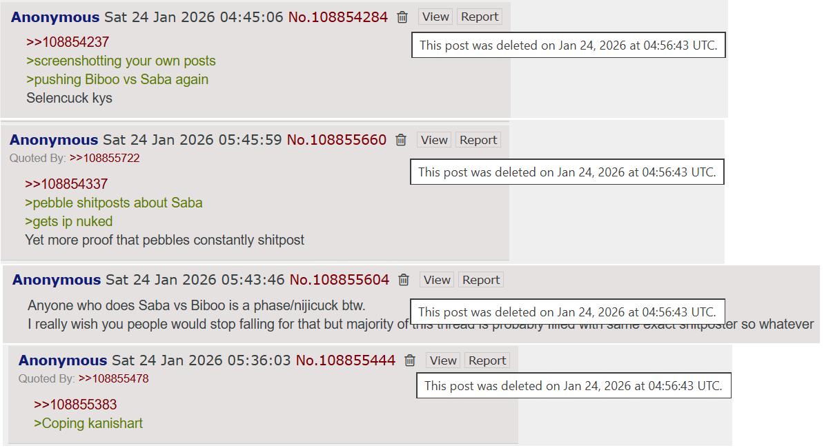 >>108854322>I mean it's obvious how he just lets Bibooschizo go hog wild for fucking hoursI don't think its intentional but every time someone attacks Biboo (usually Bibooschizo/Donnie/selentroon) it stays for fucking hours and sometimes even gets archived, but when the same thing happens to either Nimi or Saba? BOOM, nuked faster than the speed of light. Almost as if whoever is doing this has a bias AGAINST Biboo...