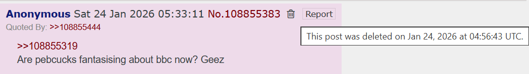 >>108854237I mean it's obvious how he just lets Bibooschizo go hog wild for fucking hours>>108854248No one would care if they deleted all shitposts instead of fucking banning people for mentioning a country name or posting a flag, fucking janny dick fucker