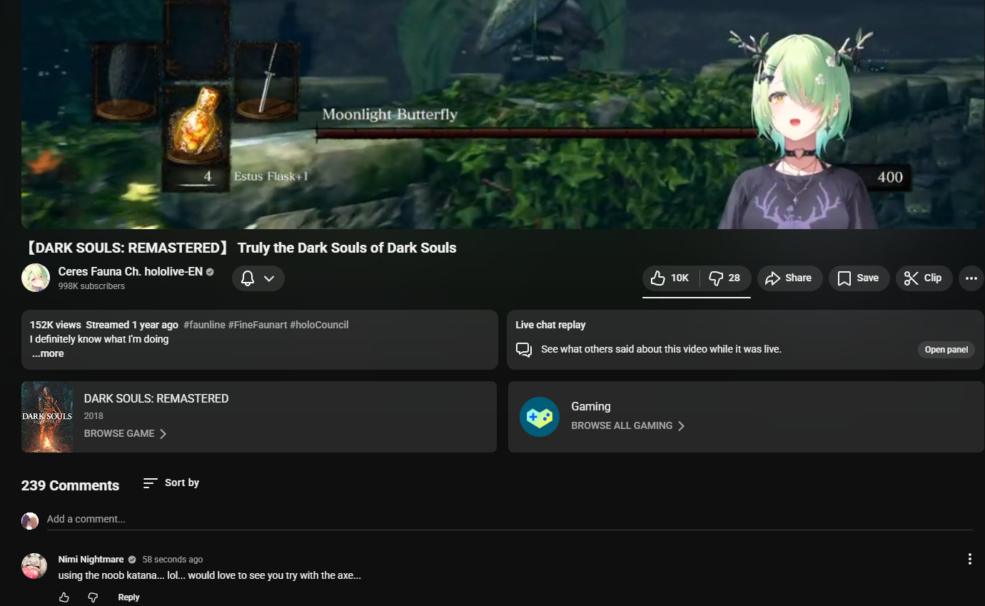 >>108861810>58 seconds ago>On a random vod which isn't even the first to come up when you search Fauna Dark Souls>Fauna doesn't have a Dark Souls playlist which will make this specific vod more difficult to find>Comment isn't present on the vod when you search it upAnon...Either you fell for photoshop or you're just a shitposter. >>108861857Another possible interpretation which is possibly stepping into schizo territory is that the screenshot originates from Nimi herself and she posted it on tower since it would be impossible for some random anon to stumble upon a comment in some obscure VOD with a 58 sec timeframe. >>108861876