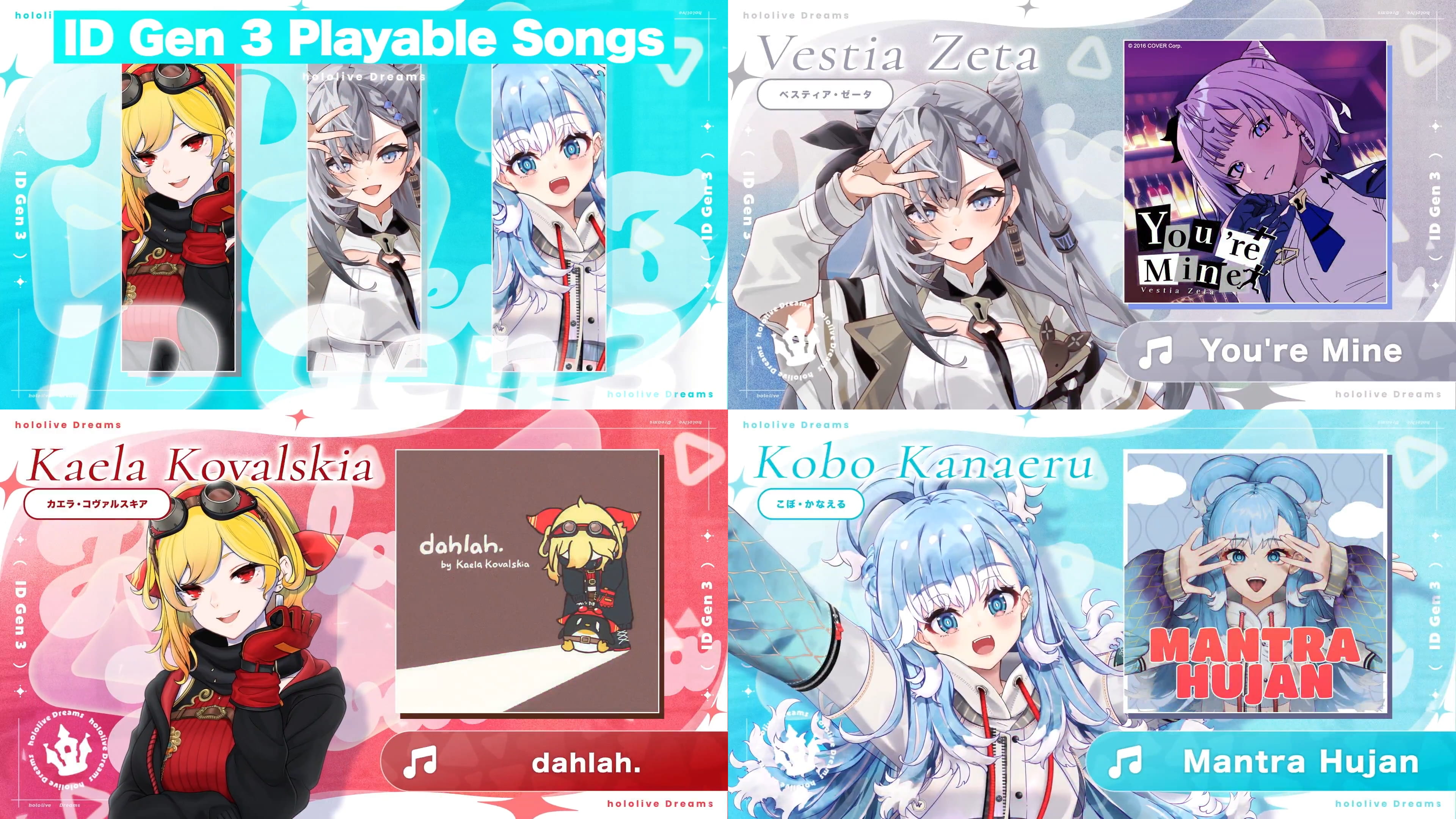 >>108856295The list for ID3 songs inclusions have been revealed.https://x.com/holo_dreams_en/status/2014895943187943935You will be able to play Zeta's You're Mine, Kaela's Dahlah, and Kobo's Mantra Hujan in the upcoming Hololive Dreams.