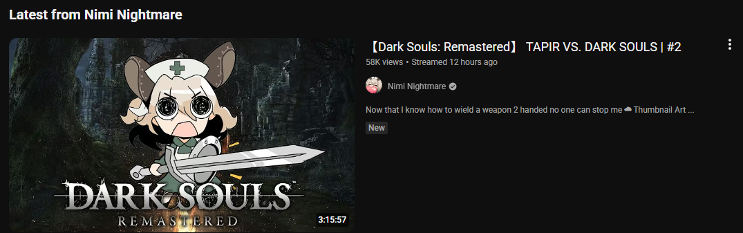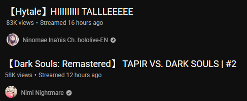 The deletes are in the three digits, I'm not going to ask. Gold for Nimi Nightmare's second playthrough of Dark Souls Remastered, Silver for Ina (alongside Kiara's) playthrough of Hytale, Bronze for Mint (!) and her playthrough of Alan Wake.