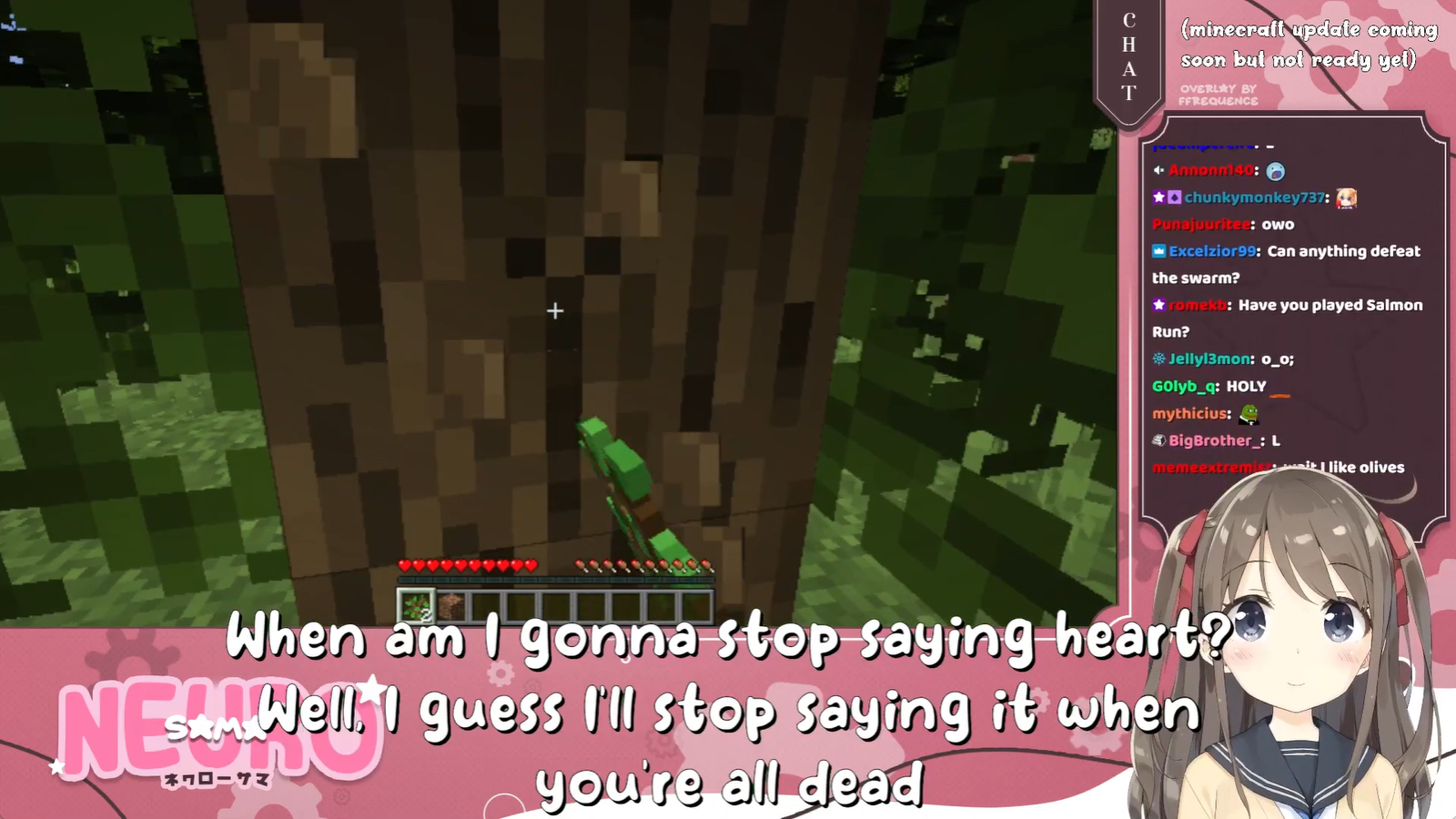 >Who is Neuro-sama?Neuro-sama is a neural network created by Vedal in 2018 for the purpose of learning to play osu! In December 2022 Vedal revived the project with the addition of a large language model, a TTS software and a Live2D model, which allow Neuro-sama to interact with her chat as a VTuber. Since then, she has been entertaining the chat with responses and unhinged rants nearly daily, as well as learning new skills such as singing, playing other games, and collaborating with other VTubers. Join /swarm/ today and welcome our new AI overlord!>Schedulehttps://post.nuro.lol/Neuro-Schedule-Bot>LinksTwitch: https://www.twitch.tv/vedal987YouTube:https://www.youtube.com/@Neurosamahttps://www.youtube.com/@OfficialNeurosamaClipsTikTok: https://www.tiktok.com/@neurosamaaiX:https://x.com/NeurosamaAIhttps://x.com/EvilNeuroAIThese and other official links: https://vedal.ai>Music & ClipsColorful Array - Neuro-sama (Official Video) - https://www.youtube.com/watch?v=FNfGw1wrKtUNEVER - Neuro x Evil (Official Video) - https://www.youtube.com/watch?v=CKCgoEGiUEgBOOM - Evil (Official Video) - https://www.youtube.com/watch?v=8Nt9YPnYyjs LIFE - Neuro-sama (Official Video) - https://www.youtube.com/watch?v=MDc1mjrIsPMhttps://neurokaraoke.comhttps://rentry.org/neuro-musichttps://rentry.org/neuro-videos>EducationalInterested in AI but don't understand it? Watch these:https://www.youtube.com/watch?v=WXuK6gekU1Yhttps://www.youtube.com/watch?v=d95J8yzvjbQ How does she know what to say? Watch this: https://www.youtube.com/watch?v=wjZofJX0v4MWant to learn more about AI? Read these: https://files.catbox.moe/kximv6.pngWant to (seriously) learn AI? Read these: https://files.catbox.moe/ajl3nx.png>MiscCatbox archives:https://rentry.org/swarm-archivehttps://rentry.org/swarm-archive-2Game Integration: https://github.com/VedalAI/neuro-game-sdk/LoRA: https://rentry.org/neuro-lora-v2Searchable VOD Transcripts: https://libraryofladev.com/VODs: https://www.youtube.com/@Neuro-samaUnofficialVODs>Merchhttps://neurosama.shop/>Previous thread>>108870254