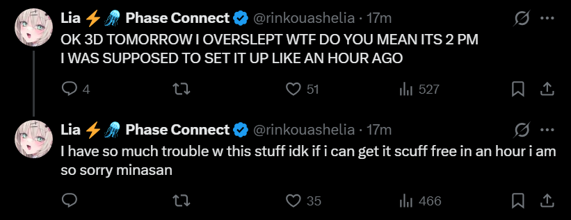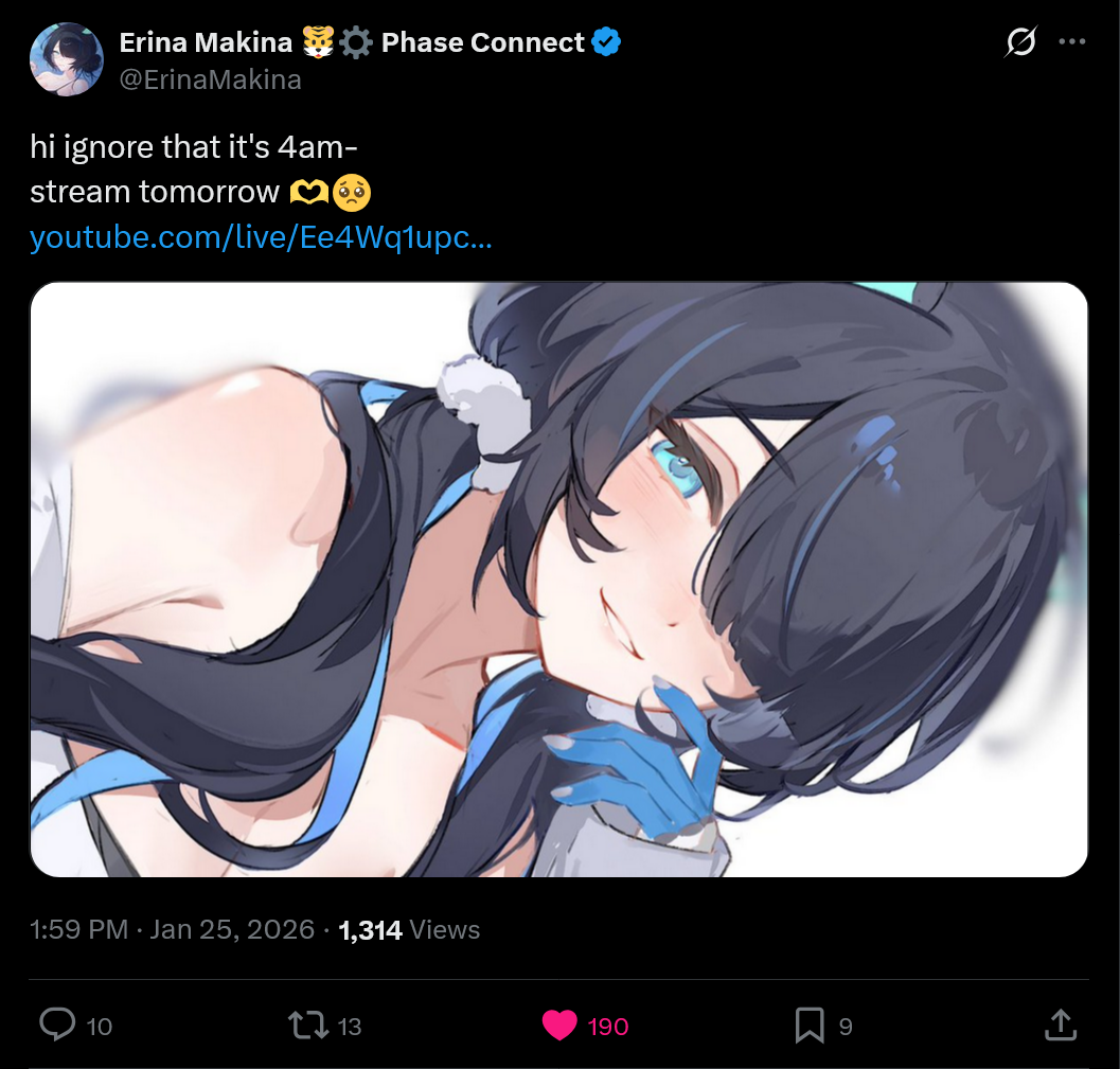 ▼ Phase Connect LinksOfficial Website: https://phase-connect.comOfficial Schedule: https://schedule.phase-connect.comOfficial Twitter: https://x.com/PhaseConnect | https://x.com/PhaseConnectJPOfficial Character References: https://rentry.org/pcgreferencesOfficial Twitch Archive Channels: https://rentry.org/pcgtwitcharchiveUnofficial Phase Connect Archives: https://rentry.org/pcgunofficialarchive––––––––––––––––––––––––––––––––––◆【Lia】https://x.com/rinkouashelia | https://youtube.com/RinkouAshelia | https://twitch.tv/asheliarinkou◆【Utatane Nasa】転寝ナサ (JP) https://x.com/UtataneNasa | https://youtube.com/UtataneNasa | https://twitch.tv/utatanenasa◆【Hakushika Iori】白鹿いおり (JP + EN) https://x.com/hakushikaiori | https://youtube.com/HakushikaIori | https://twitch.tv/iorihakushika◆【Fujikura Uruka】https://x.com/fujikurauruka | https://youtube.com/FujikuraUruka | https://twitch.tv/fujikurauruka◆【Shisui Michiru】紫翠みちる (JP) https://x.com/shisuimichiru | https://youtube.com/ShisuiMichiru | https://twitch.tv/michiru_shisui◆【Tenma Maemi】https://x.com/tenmamaemi | https://youtube.com/TenmaMaemi | https://twitch.tv/tenma◆【Pipkin Pippa】https://x.com/pipkinpippa | https://youtube.com/PipkinPippa | https://twitch.tv/pippa––––––––––––––––––––––––––––––––––◆【Kaneko Lumi】https://x.com/kaneko_lumi | https://youtube.com/KanekoLumi | https://twitch.tv/kanekolumi◆【Fuura Yuri】[Terminated] https://x.com/AmarisYuri | Archive: https://youtube.com/@TheNationalFuuraYuriArchive◆【Dizzy Dokuro】https://x.com/dizzydokuro | https://youtube.com/@dizzydokuro | https://twitch.tv/dizzydokuro◆【Jelly Hoshiumi】https://x.com/jellyhoshiumi | https://youtube.com/@jellyhoshiumi | https://twitch.tv/jellyhoshiumi◆【Ember Amane】https://x.com/emberamane | https://youtube.com/@EmberAmane | https://twitch.tv/emberamane◆【Clio Aite】https://x.com/ClioAite | https://youtube.com/@ClioAite | https://twitch.tv/clioaite◆【MariMari_en】https://x.com/MARIMARI_EN | https://youtube.com/@MARIMARI_EN | https://twitch.tv/marimari_en◆【Eepy Sleepy】https://x.com/EepySleepyCh | https://www.youtube.com/@EepySleepyCh | https://twitch.tv/EepySleepyCh––––––––––––––––––––––––––––––––––◆【Remilia Nephys】https://x.com/Remilia_Nephys | https://youtube.com/RemiliaNephys | https://twitch.tv/remilianephys◆【Chisaka Airi】https://x.com/ChisakaAiri | https://youtube.com/ChisakaAiri | https://twitch.tv/chisakaairi◆【Amanogawa Shiina】https://x.com/AmanogawaShiina | https://youtube.com/AmanogawaShiina | https://twitch.tv/amanogawashiina◆【Himemiya Rie】https://x.com/HimemiyaRie | https://youtube.com/HimemiyaRie | https://twitch.tv/himemiyarie◆【Erina Makina】https://x.com/ErinaMakina | https://youtube.com/ErinaMakina | https://twitch.tv/erinamakina◆【Komachi Panko】https://x.com/komachipanko | https://youtube.com/KomachiPanko | https://twitch.tv/komachipanko––––––––––––––––––––––––––––––––––◆【Runie Ruse】https://x.com/RunieRuse | https://youtube.com/@RunieRuse | https://twitch.tv/RunieRuse◆【Eimi Isami】https://x.com/eimiisami | https://youtube.com/@eimiisami | https://twitch.tv/eimiisami◆【Muu Muyu】https://x.com/Muu_Muyu | https://youtube.com/@MuuMuyu | https://twitch.tv/MuuMuyu◆【Hikanari Hina】https://x.com/HikanariHina | https://youtube.com/@HikanariHina | https://twitch.tv/HikanariHina◆【Saya Sairroxs】[Hort] https://x.com/sayasairroxs | https://youtube.com/@sayasairroxs | https://twitch.tv/sayasairroxs––––––––––––––––––––––––––––––––––◆【Kannagi Loki】巫ロキ (JP) https://x.com/kannagiloki | https://youtube.com/@kannagiloki◆【Kokoromo Memory】恋衣めもり (JP) https://x.com/kokoromomemory | https://youtube.com/@kokoromomemory_ | https://twitch.tv/kokoromomemory◆【Gram Pico】倉夢ぴこ (JP) https://x.com/grampico_ | https://youtube.com/@grampico | https://twitch.tv/grampico◆【Ayase Yuu】絢世ユウ (JP) https://x.com/ayaseyuuu | https://youtube.com/@ayaseyuu | https://twitch.tv/ayaseyuu_◆【Kaminari Clara】歌美鳴クララ (EN + JP) https://x.com/kaminariclara_ | https://youtube.com/@kaminariclara | https://twitch.tv/kaminariclara––––––––––––––––––––––––––––––––––◆【Malice Evermore】https://x.com/MaliceEvermore | https://www.youtube.com/@maliceevermore | https://www.twitch.tv/maliceevermore◆【Nitya Nil】https://x.com/Nitya_Nil | https://www.youtube.com/@Nitya_Nil | https://www.twitch.tv/nitya_nil◆【Wilhelmina Frost】https://x.com/wilhelminafr0st | https://www.youtube.com/@wilhelminafrost | https://www.twitch.tv/wilhelminafrost◆【Bibi Biscuit】https://x.com/BibiBiscuitCh | https://www.youtube.com/@bibibiscuitch | https://www.twitch.tv/bibibiscuitch◆【Anya Nyabyss】https://x.com/AnyaNyabyss | https://www.youtube.com/@AnyaNyabyss | https://www.twitch.tv/anyanyabyss◆【Sinon Sinfonia】https://x.com/SinonSinfonia | https://www.youtube.com/@SinonSinfonia | https://www.twitch.tv/sinonsinfoniaPrevious Thread: >>108892725