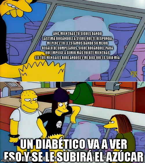Ang, mientras tú sigues dando lástima rogándole a Sylvie que te responda, mi pene y yo le estamos dando su mejor regalo de cumpleaños. sigue rogándole para que empiece a gemir más fuerte mientras lee tus mensajes burlandose y me dice que es solo mía