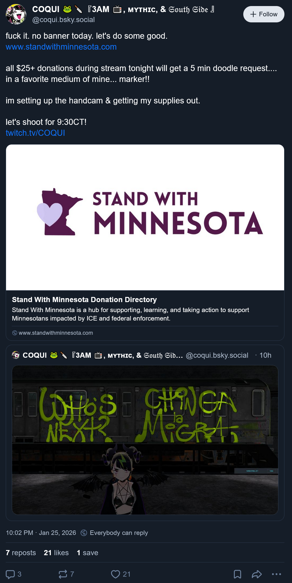 Coqui reaps the benefits from living in a red state where ICE won't tread and her ass isn't going to drive to Minnesota to actually do anything so this all feels performative.