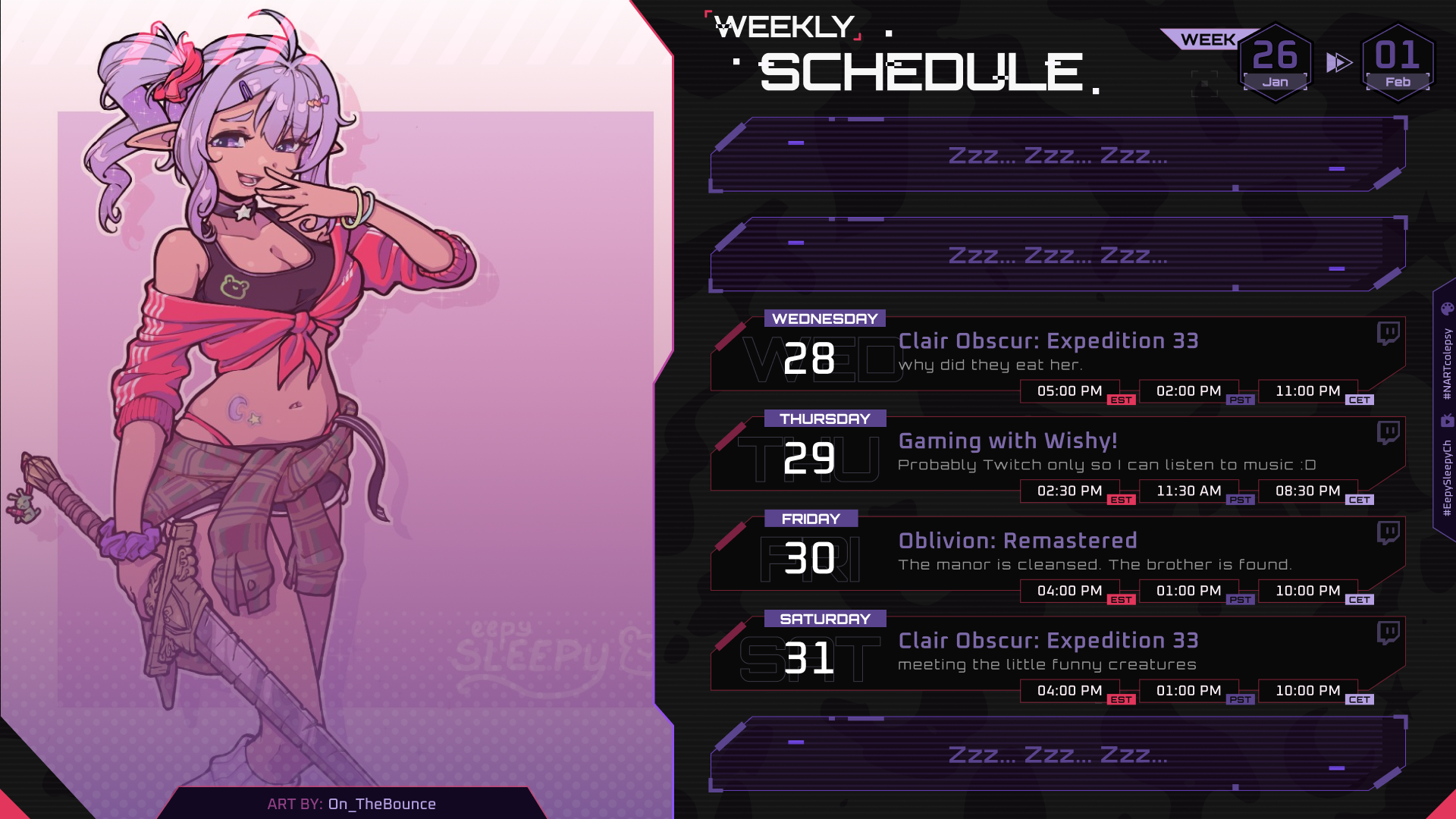 Eepy nowhttps://www.youtube.com/watch?v=mrcf4Y66VG8https://www.twitch.tv/eepysleepy