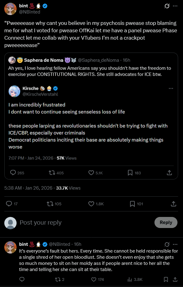 If you're bored waiting for Alana to start, you can read about the latest twooter meltyhttps://x.com/KirscheVerstahl/status/2015878636818334108