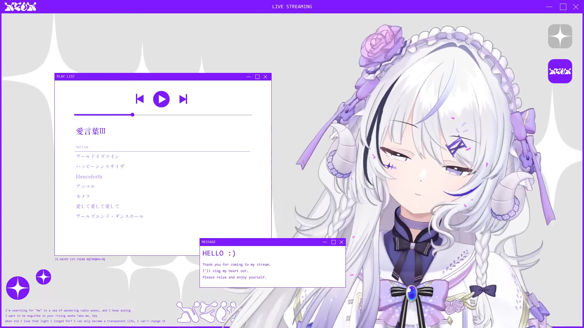 Song Frames and Special EventsSoraduki Tyra x Akane Kanna x Enma Ruri x Orisaki Moshu Rap Battle Song Framehttps://www.youtube.com/watch?v=xNw6SMcbikIHachiya Nia 3D Pianohttps://www.youtube.com/watch?v=wgCaEFIH-R4CULUA Playlist 20https://www.youtube.com/watch?v=zaDTmoxZ9wYFelicia 500 likes endurancehttps://www.youtube.com/watch?v=EnE4yhATUAUHiura Kurohttps://www.youtube.com/watch?v=Uv7f9rYX_K4NEPHLAhttps://www.youtube.com/watch?v=lHF1G_GkWqgMokan YOASOBI Song Framehttps://www.youtube.com/watch?v=u2IkEs7bpgYUzuna Hazuki 2,600 subs endurancehttps://www.youtube.com/watch?v=8nHHNn3cU70Umitsuki Shell Roulette Karaokehttps://www.youtube.com/watch?v=d8jsjgCfxuE