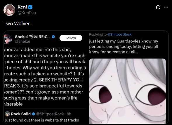 >>108939850its already happening, already saw a bunch of vtuber getting mad about being on it on twitterthey don't get that they are the minority because most vtubers love being stalked