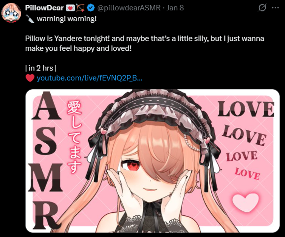 Sleepy Edition>Previous thread>>108874950>YouTubehttps://youtube.com/@pillowdear>Twitter/Xhttps://x.com/pillowdearasmr>Merchhttps://uwumarket.us/collections/pillowdearasmr>Fan website & resourceshttps://piwwow.love/>Fan wikihttps://virtualyoutuber.fandom.com/wiki/PillowDear>Latest coverhttps://www.youtube.com/watch?v=Ns08Y6GYWEc>Latest eventhttps://www.youtube.com/watch?v=8C6LGy2A4S8 >Latest streamhttps://www.youtube.com/watch?v=PxMUn1Rm9Ts>Upcoming streamTarot Cards TBD