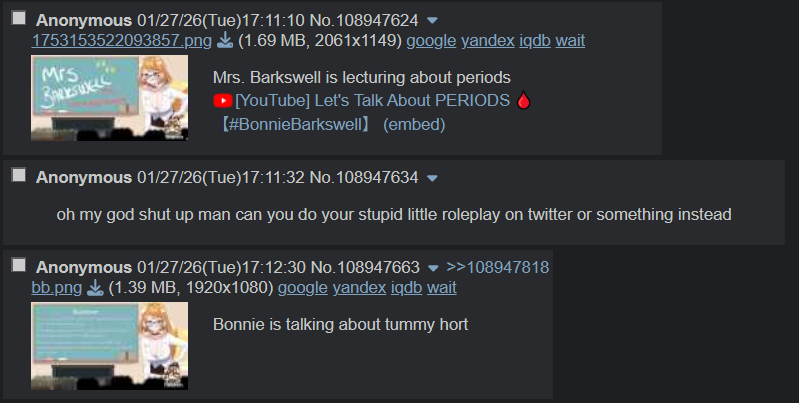 >>108948883Don't forget about the fag who posts images on cooldown when they have a melty about the op
