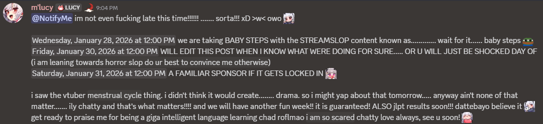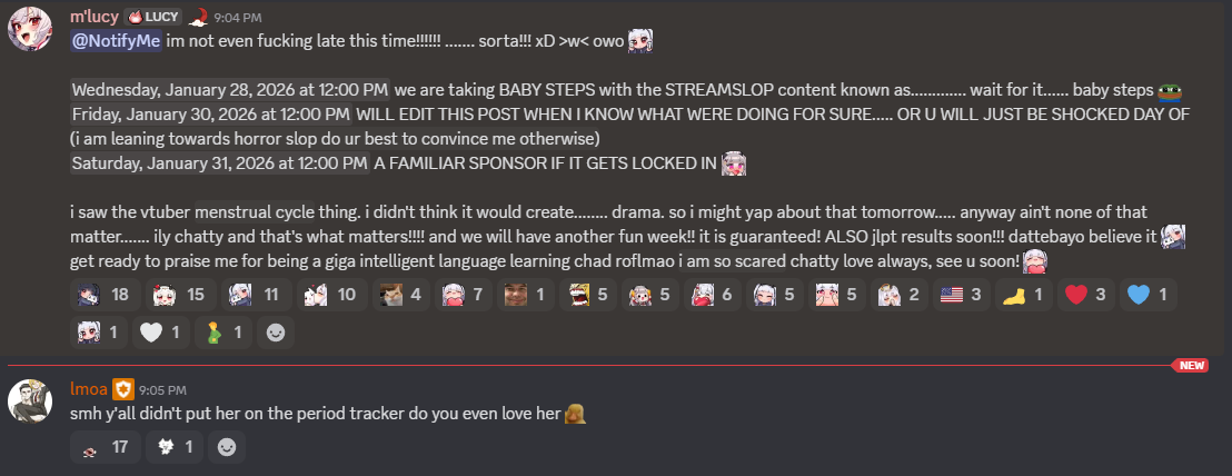 Hello liggermen! This is normally where i ask if all is well but uuhhhhhhhh yeah, I can read. Anyways I'm doing good and it's time for /lig/ vtubers live!LIVE NOW:Limes: Cult Of the Lamb>https://www.twitch.tv/limealiciousHenya: Chatting now, games later>https://www.twitch.tv/henyathegeniusNyanners: Geogusser and Hytale>https://www.twitch.tv/nyannersShondo: Dark Souls>https://www.twitch.tv/fallenshadowCerber: Just Chatting>https://www.twitch.tv/cerbervtgirl_dm: Undertale>https://www.twitch.tv/girl_dm_Kirsche: Just Chatting>https://www.twitch.tv/kirscheAlana: Just Chatting>https://www.twitch.tv/smugalanaSaiiren: Minecraft>https://www.twitch.tv/saiirenJuniper: Code Vein 2>https://www.twitch.tv/juniperactiasNina: Subnautica>https://www.twitch.tv/ninanininGeega: GTA RP on her alt>https://www.twitch.tv/notgeegaUwo: Making a drum sequencing device>https://www.twitch.tv/uwoslabJowol: Just Chatting>https://www.twitch.tv/porcelainmaidMiwa: ASMR>https://www.twitch.tv/miwaMeicha: Arc Raiders>https://www.twitch.tv/meichaPillow: Fortune Readings>https://www.youtube.com/watch?v=eE3HWya7aEkCallie Calico: My Winter Car>https://www.twitch.tv/calliecalicoFang: Phantom Hourglass>https://www.twitch.tv/fangguuFenari Mori: Abiotic Fear>https://www.twitch.tv/fenariMimi: Art>https://www.twitch.tv/henemimiEbiko: Just Chatting>https://www.twitch.tv/ebikoand more are live on /vt/ list https://vt.rita.moe/?sort=viewersASC&tag=thread:/lig/Later tonight we have a Minto/Phoebe Cookie Run Kingdom collab, Miki with Huniepop, a coqui art stream and likely many more! regardless of your viewing decisions have a fantastic night my liggas and I will see you all next time