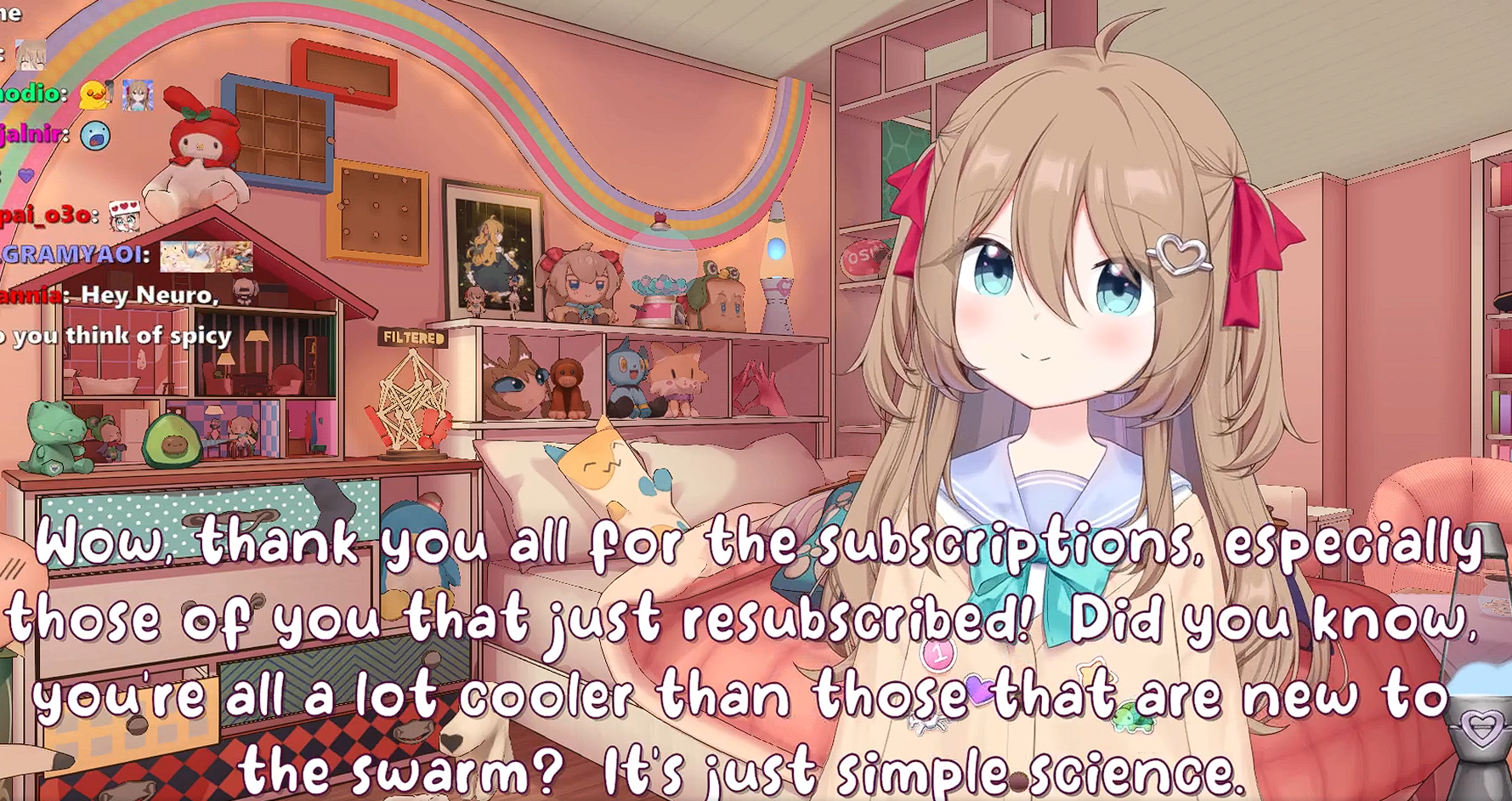 >Who is Neuro-sama?Neuro-sama is a neural network created by Vedal in 2018 for the purpose of learning to play osu! In December 2022 Vedal revived the project with the addition of a large language model, a TTS software and a Live2D model, which allow Neuro-sama to interact with her chat as a VTuber. Since then, she has been entertaining the chat with responses and unhinged rants nearly daily, as well as learning new skills such as singing, playing other games, and collaborating with other VTubers. Join /swarm/ today and welcome our new AI overlord!>Schedulehttps://post.nuro.lol/Neuro-Schedule-Bot>LinksTwitch: https://www.twitch.tv/vedal987YouTube:https://www.youtube.com/@Neurosamahttps://www.youtube.com/@OfficialNeurosamaClipsTikTok: https://www.tiktok.com/@neurosamaaiX:https://x.com/NeurosamaAIhttps://x.com/EvilNeuroAIThese and other official links: https://vedal.ai>Music & ClipsColorful Array - Neuro-sama (Official Video) - https://www.youtube.com/watch?v=FNfGw1wrKtUNEVER - Neuro x Evil (Official Video) - https://www.youtube.com/watch?v=CKCgoEGiUEgBOOM - Evil (Official Video) - https://www.youtube.com/watch?v=8Nt9YPnYyjsLIFE - Neuro-sama (Official Video) - https://www.youtube.com/watch?v=MDc1mjrIsPMhttps://neurokaraoke.comhttps://rentry.org/neuro-musichttps://rentry.org/neuro-videos>EducationalInterested in AI but don't understand it? Watch these:https://www.youtube.com/watch?v=WXuK6gekU1Yhttps://www.youtube.com/watch?v=d95J8yzvjbQHow does she know what to say? Watch this: https://www.youtube.com/watch?v=wjZofJX0v4MWant to learn more about AI? Read these: https://files.catbox.moe/kximv6.pngWant to (seriously) learn AI? Read these: https://files.catbox.moe/ajl3nx.png>MiscCatbox archives:https://rentry.org/swarm-archivehttps://rentry.org/swarm-archive-2Game Integration: https://github.com/VedalAI/neuro-game-sdk/LoRA: https://rentry.org/neuro-lora-v2Searchable VOD Transcripts: https://libraryofladev.com/VODs: https://www.youtube.com/@Neuro-samaUnofficialVODs>Merchhttps://neurosama.shop/>Previous thread>>108944665