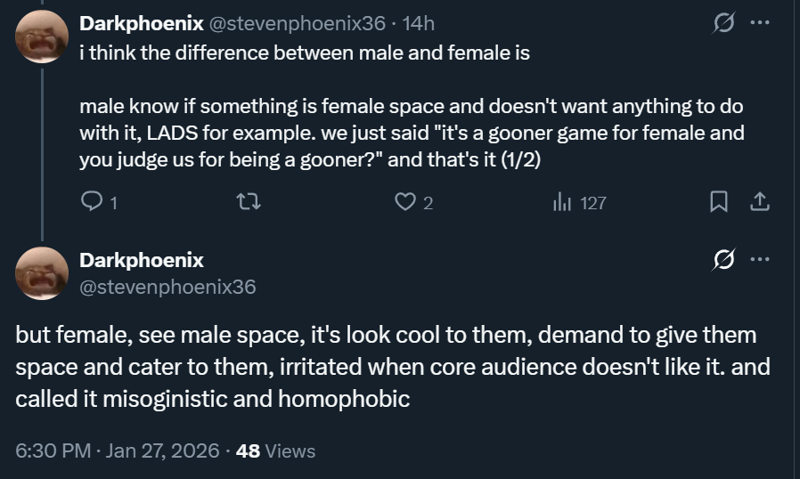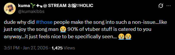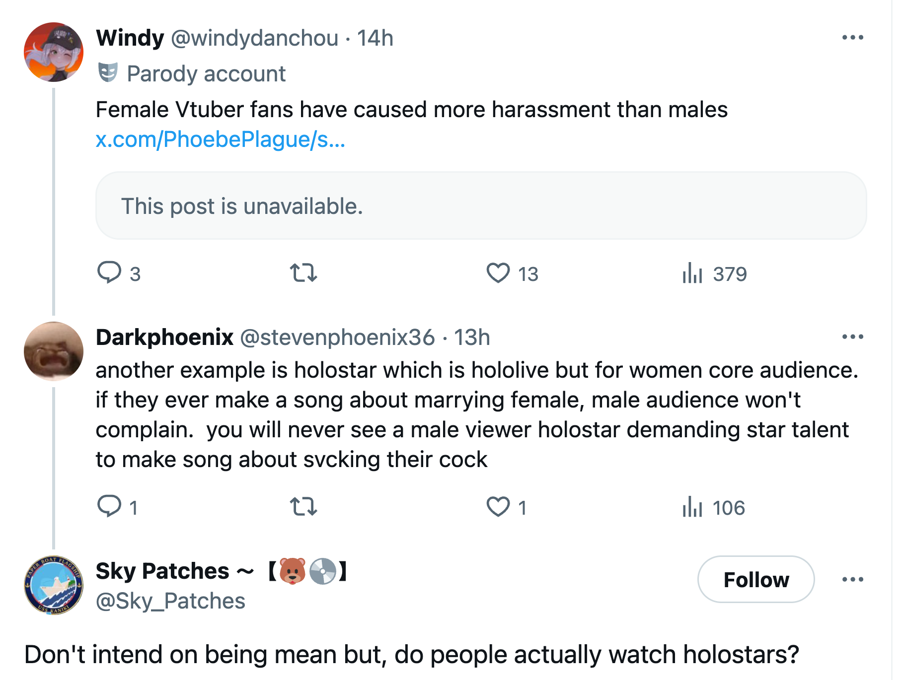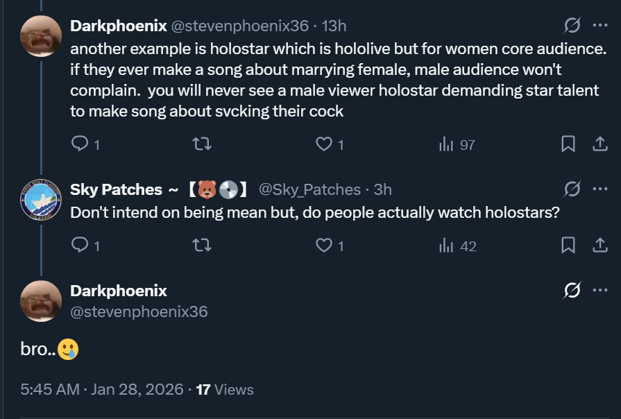 I unironically do not believe that holostars has a core female audience. I would sooner believe it's gay men and self inserters or whatever you call male streamer fans
