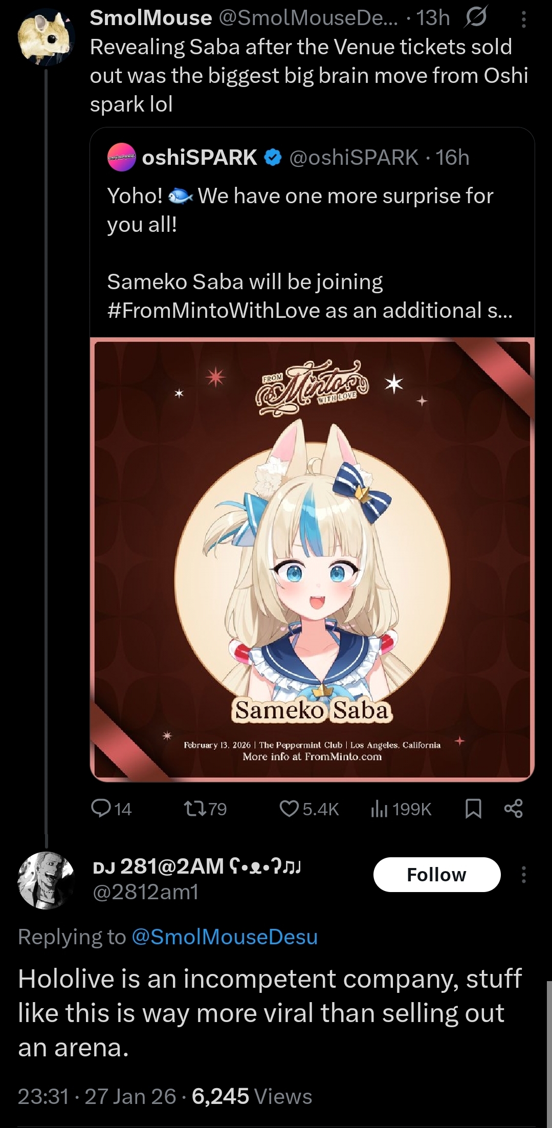 She had 50k streams though. A thing she can't have anymore as Saba without a 3D reveal or lives.