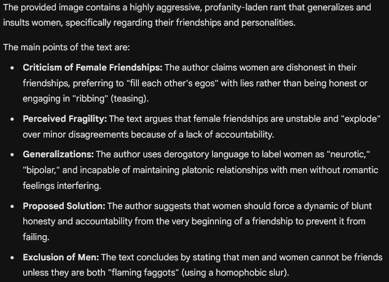 The problem with women is that they are FUCKING RETARDED.The way they do friendships is stupid. So it's VERY VERY easy for them to fuck it up and end a friendship over nothing.For some reason women have made it so their friendships involve metaphorically sucking each other off AT ALL TIMES. They can never be honest and if they are honest it's like a betrayal to them.If you've ever seen an obese bitch's profile and all the women claiming she's perfection incarnate, this is why. Women show friendship instead of ribbing each other and making fun of each other but still having each others backs, by LYING to each other about EVERYONE to always take their side and bs to fill their egos. This is why women suck at friends, especially online introvert women that don't understand well anything really. They say ONE "wrong" thing one day and the friendship explodes. So they're always lonely and they fill that void with cock. Since they are neurotic and bipolar they WILL argue over stupid nonsense eventually.Solution? Make sure your female friends will FROM THE START do shit like make each other take accountability and be honest so it's not unexpected and abnormal so they get used to it. Don't be friends with men. Men and women can't be friends. One or both always catches feelings. That just ends in misery for both. >But what if!No. Only even consider it if the man and woman are BOTH flaming faggots.