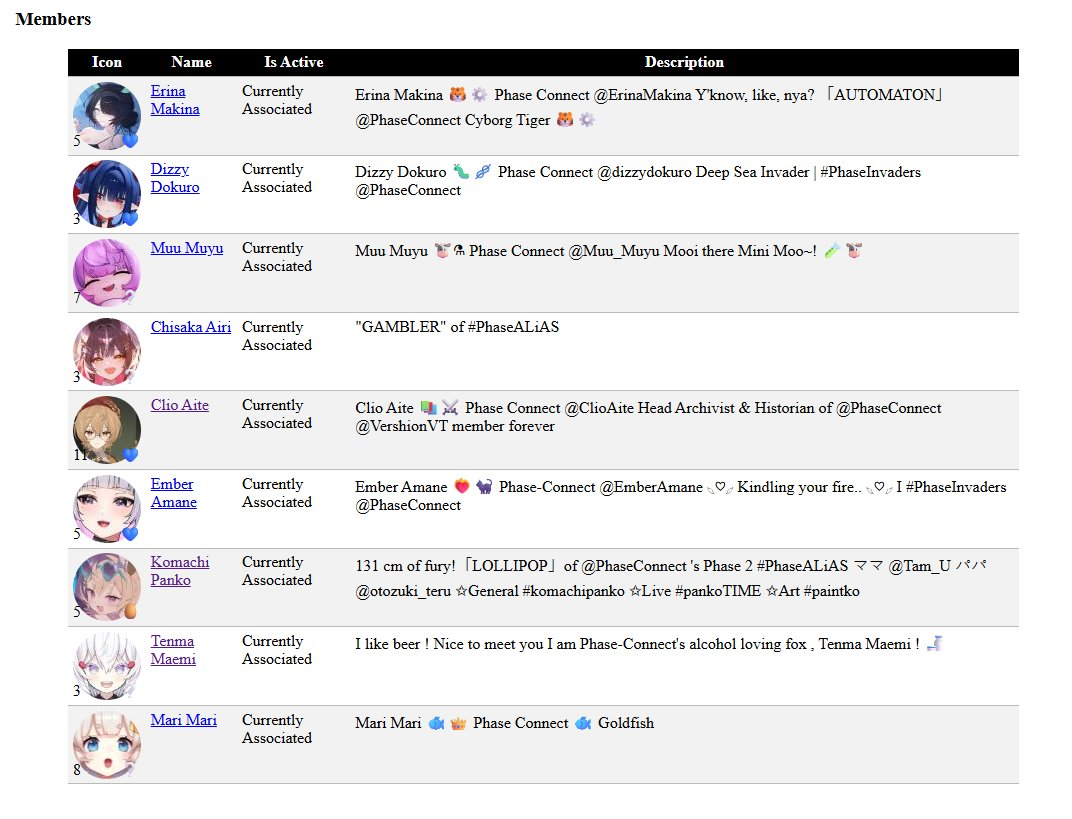 ▼ Phase Connect LinksOfficial Website: https://phase-connect.comOfficial Schedule: https://schedule.phase-connect.comOfficial Twitter: https://x.com/PhaseConnect | https://x.com/PhaseConnectJPOfficial Character References: https://rentry.org/pcgreferencesOfficial Twitch Archive Channels: https://rentry.org/pcgtwitcharchiveUnofficial Phase Connect Archives: https://rentry.org/pcgunofficialarchive––––––––––––––––––––––––––––––––––◆【Lia】https://x.com/rinkouashelia | https://youtube.com/RinkouAshelia | https://twitch.tv/asheliarinkou◆【Utatane Nasa】転寝ナサ (JP) https://x.com/UtataneNasa | https://youtube.com/UtataneNasa | https://twitch.tv/utatanenasa◆【Hakushika Iori】白鹿いおり (JP + EN) https://x.com/hakushikaiori | https://youtube.com/HakushikaIori | https://twitch.tv/iorihakushika◆【Fujikura Uruka】https://x.com/fujikurauruka | https://youtube.com/FujikuraUruka | https://twitch.tv/fujikurauruka◆【Shisui Michiru】紫翠みちる (JP) https://x.com/shisuimichiru | https://youtube.com/ShisuiMichiru | https://twitch.tv/michiru_shisui◆【Tenma Maemi】https://x.com/tenmamaemi | https://youtube.com/TenmaMaemi | https://twitch.tv/tenma◆【Pipkin Pippa】https://x.com/pipkinpippa | https://youtube.com/PipkinPippa | https://twitch.tv/pippa––––––––––––––––––––––––––––––––––◆【Kaneko Lumi】https://x.com/kaneko_lumi | https://youtube.com/KanekoLumi | https://twitch.tv/kanekolumi◆【Fuura Yuri】[Terminated] https://x.com/AmarisYuri | Archive: https://youtube.com/@TheNationalFuuraYuriArchive◆【Dizzy Dokuro】https://x.com/dizzydokuro | https://youtube.com/@dizzydokuro | https://twitch.tv/dizzydokuro◆【Jelly Hoshiumi】https://x.com/jellyhoshiumi | https://youtube.com/@jellyhoshiumi | https://twitch.tv/jellyhoshiumi◆【Ember Amane】https://x.com/emberamane | https://youtube.com/@EmberAmane | https://twitch.tv/emberamane◆【Clio Aite】https://x.com/ClioAite | https://youtube.com/@ClioAite | https://twitch.tv/clioaite◆【MariMari_en】https://x.com/MARIMARI_EN | https://youtube.com/@MARIMARI_EN | https://twitch.tv/marimari_en◆【Eepy Sleepy】https://x.com/EepySleepyCh | https://youtube.com/@EepySleepyCh | https://twitch.tv/EepySleepy––––––––––––––––––––––––––––––––––◆【Remilia Nephys】https://x.com/Remilia_Nephys | https://youtube.com/RemiliaNephys | https://twitch.tv/remilianephys◆【Chisaka Airi】https://x.com/ChisakaAiri | https://youtube.com/ChisakaAiri | https://twitch.tv/chisakaairi◆【Amanogawa Shiina】https://x.com/AmanogawaShiina | https://youtube.com/AmanogawaShiina | https://twitch.tv/amanogawashiina◆【Himemiya Rie】https://x.com/HimemiyaRie | https://youtube.com/HimemiyaRie | https://twitch.tv/himemiyarie◆【Erina Makina】https://x.com/ErinaMakina | https://youtube.com/ErinaMakina | https://twitch.tv/erinamakina◆【Komachi Panko】https://x.com/komachipanko | https://youtube.com/KomachiPanko | https://twitch.tv/komachipanko––––––––––––––––––––––––––––––––––◆【Runie Ruse】https://x.com/RunieRuse | https://youtube.com/@RunieRuse | https://twitch.tv/RunieRuse◆【Eimi Isami】https://x.com/eimiisami | https://youtube.com/@eimiisami | https://twitch.tv/eimiisami◆【Muu Muyu】https://x.com/Muu_Muyu | https://youtube.com/@MuuMuyu | https://twitch.tv/MuuMuyu◆【Hikanari Hina】https://x.com/HikanariHina | https://youtube.com/@HikanariHina | https://twitch.tv/HikanariHina◆【Saya Sairroxs】[Hort] https://x.com/sayasairroxs | https://youtube.com/@sayasairroxs | https://twitch.tv/sayasairroxs––––––––––––––––––––––––––––––––––◆【Kannagi Loki】巫ロキ (JP) https://x.com/kannagiloki | https://youtube.com/@kannagiloki ◆【Kokoromo Memory】恋衣めもり (JP) https://x.com/kokoromomemory | https://youtube.com/@kokoromomemory_ | https://twitch.tv/kokoromomemory◆【Gram Pico】倉夢ぴこ (JP) https://x.com/grampico_ | https://youtube.com/@grampico | https://twitch.tv/grampico◆【Ayase Yuu】絢世ユウ (JP) https://x.com/ayaseyuuu | https://youtube.com/@ayaseyuu | https://twitch.tv/ayaseyuu_◆【Kaminari Clara】歌美鳴クララ (EN + JP) https://x.com/kaminariclara_ | https://youtube.com/@kaminariclara | https://twitch.tv/kaminariclara––––––––––––––––––––––––––––––––––◆【Malice Evermore】https://x.com/MaliceEvermore | https://youtube.com/@maliceevermore | https://twitch.tv/maliceevermore◆【Nitya Nil】https://x.com/Nitya_Nil | https://youtube.com/@Nitya_Nil | https://twitch.tv/nitya_nil◆【Wilhelmina Frost】https://x.com/wilhelminafr0st | https://youtube.com/@wilhelminafrost | https://twitch.tv/wilhelminafrost◆【Bibi Biscuit】https://x.com/BibiBiscuitCh | https://youtube.com/@bibibiscuitch | https://twitch.tv/bibibiscuitch◆【Anya Nyabyss】https://x.com/AnyaNyabyss | https://youtube.com/@AnyaNyabyss | https://twitch.tv/anyanyabyss◆【Sinon Sinfonia】https://x.com/SinonSinfonia | https://youtube.com/@SinonSinfonia | https://twitch.tv/sinonsinfoniaPrevious Thread: >>108965620