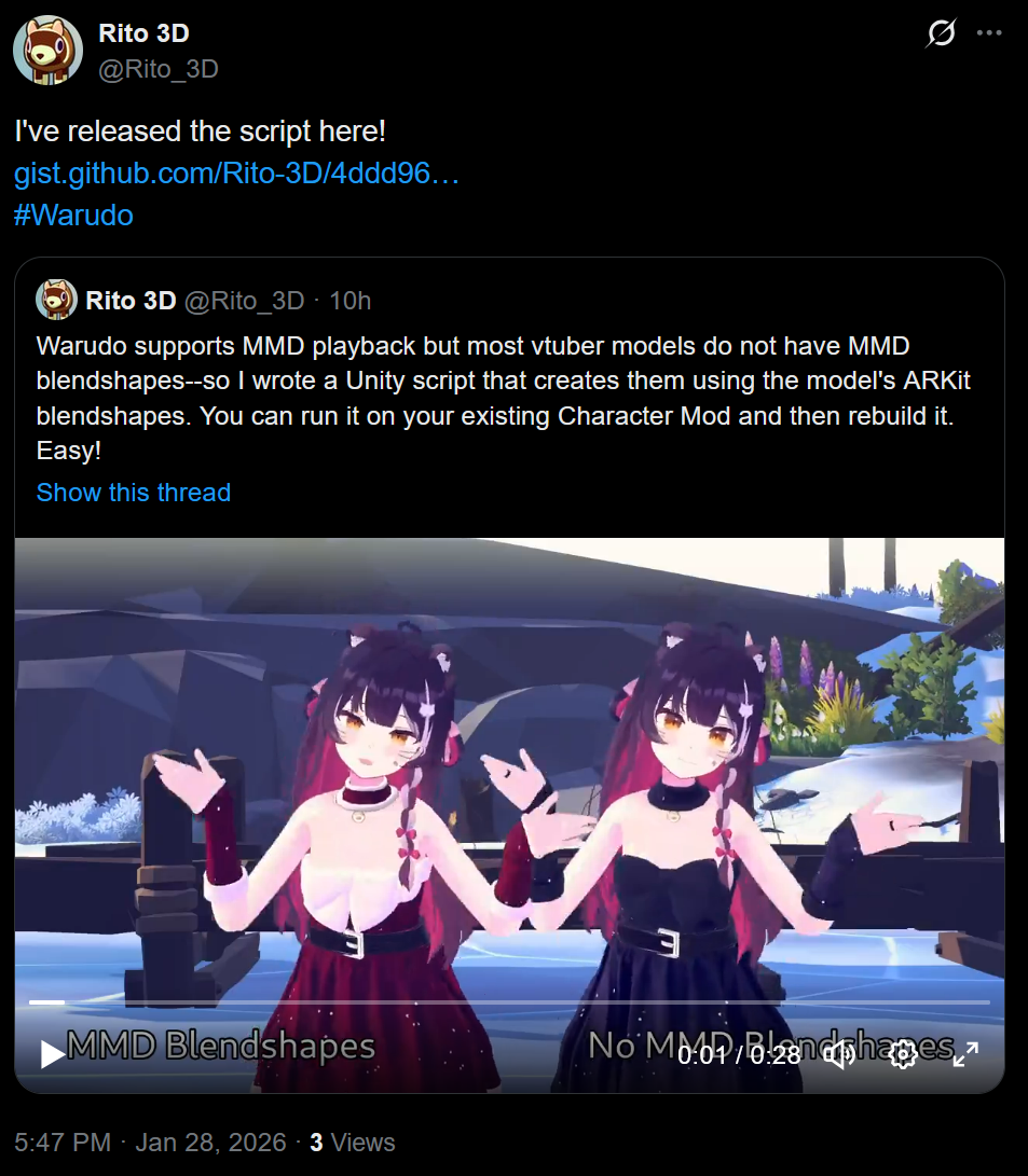 I'm not entirely sure what this means, but someone just released a script that converts a model's ARKit blendshapes into MMD blendshapes, allowing 3D models to use the face tracking on MMD animations when they're plugged into Warudohttps://x.com/Rito_3D/status/2016644387770417325
