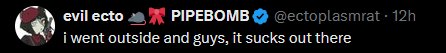 >>108979886I remember looking through the quote tweets and one of them was some chuuni shit like "this is so fucking 'ugh' and If I find out you edited me onto here I will systematically ensure you're incapable of following me or any of my mutuals for your next 30 lifetimes" or some shit and then I hovered their name and they were a pre-debut vtweeter that had like 300 followers and 10 likes on the post