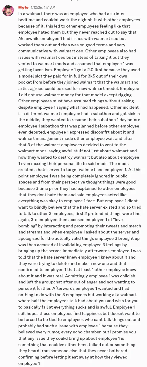 >>108982157 (talent cliques)Hades of Mythos, now again Hylo, talks about her time at "Walmart", suggesting that she may have left the company more due to inter-talent spats than due to the CEO or the company itself, which may explain why she's still leaving despite the CEO and ownership changeover:https://archive.vn/xfuHu