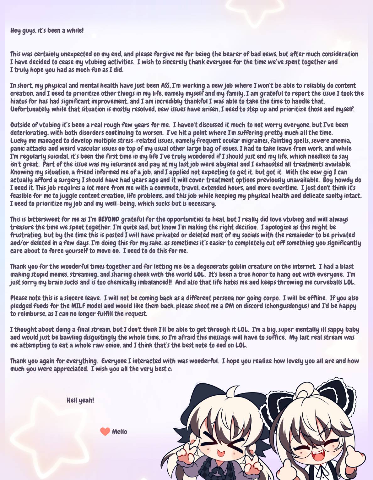 >>108981251Indie Vtuber Chongus Dongus/Mello Mutinus announces her graduation following a lengthy hiatus. She will be deleting and privating all of her social medias and has already mostly done so, so this tweet will likely go down in the next few dayshttps://x.com/ChongusDongus/status/2017043522117931162https://files.catbox.moe/98n5hg.png