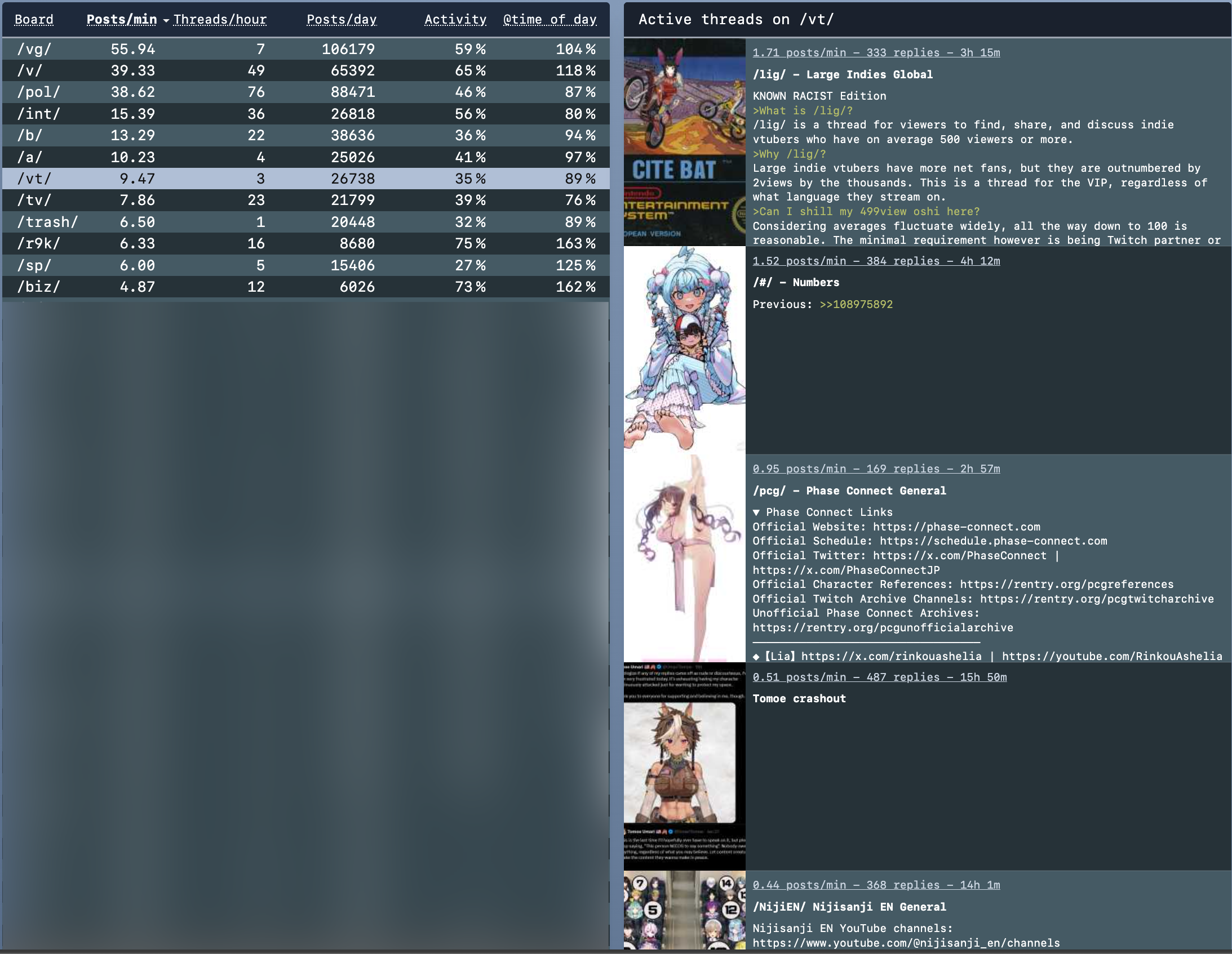 *GENERAL NUMBERFAG SITES*>https://playboard.co/en/>http://ikioi-ranking.com/>https://vrabi.net/>https://live-ranking.userlocal.jp/vtuber-rankingHololive sites>https://www.hololyzer.net/youtube/index.html>https://trackholo.live/en/>https://holo-spotify-stats.jirikunes.eu/Twitch>https://sullygnome.com/>https://twitchtracker.com/>https://stats.roki.sh/>https://streamscharts.com/