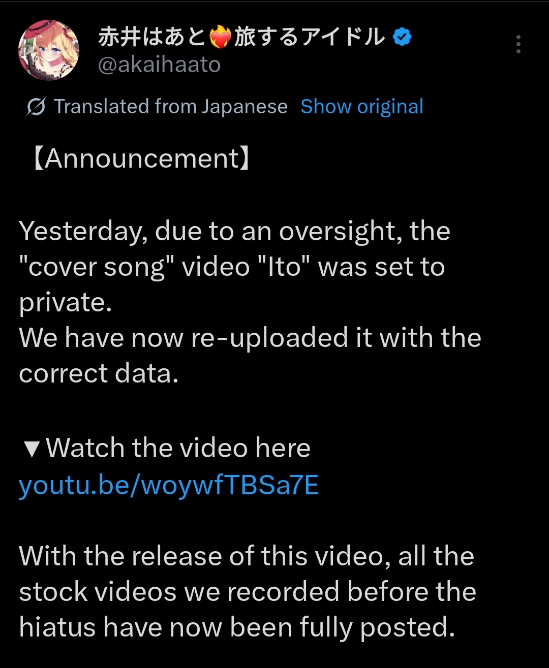 https://x.com/i/status/2016799048972587325Management reuploaded Haachama's Fuji cover. the new one has the Coke bottle scene and english lyrics removed.